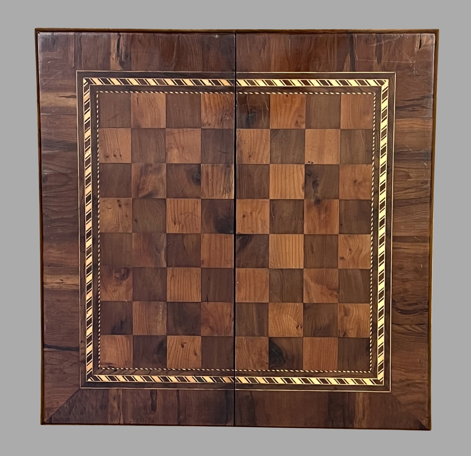 19TH CENTURY ENGLISH INLAID WALNUT FOLDING CHECKER AND BACKGAMMON BOARD