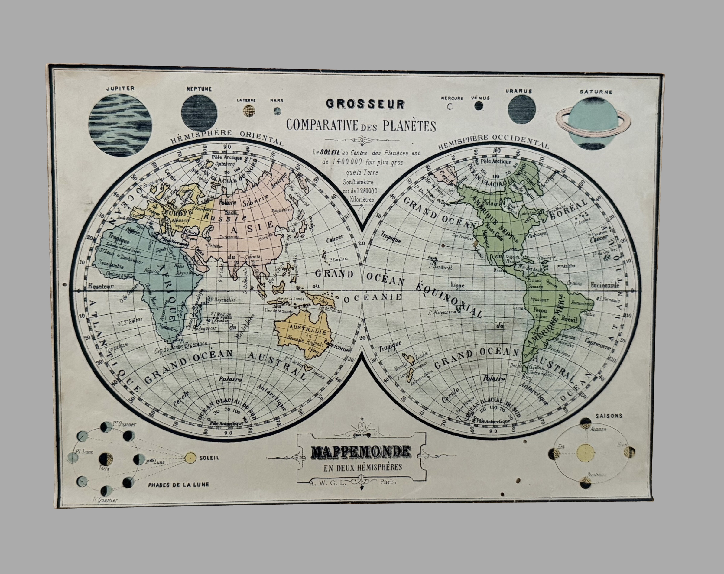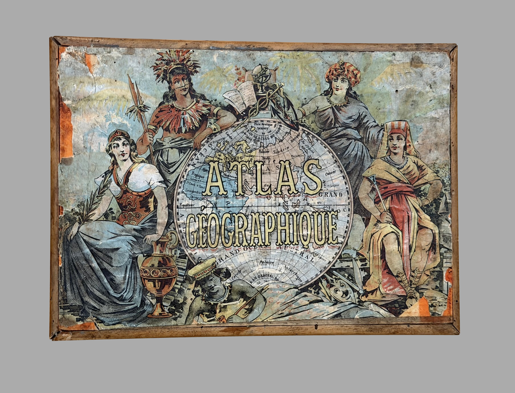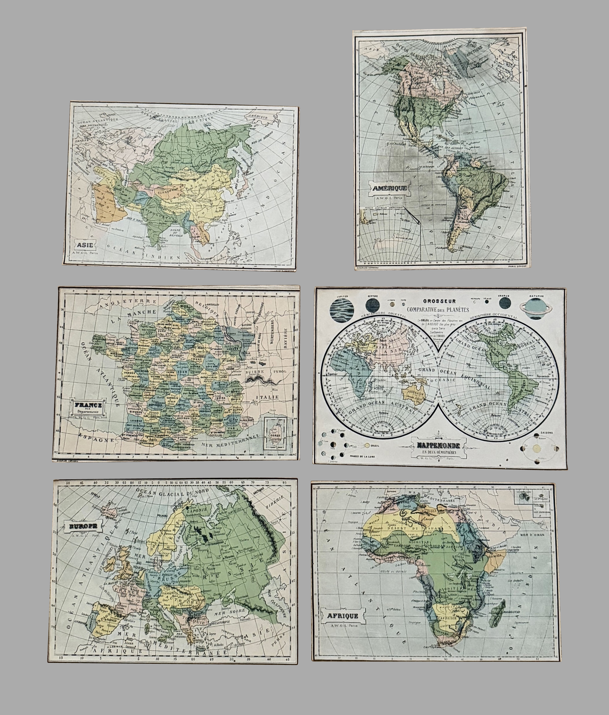 An antique French puzzle box containing 35 cubes which can be assembled into maps of Asia, Africa, North and South America, Europe, France, and the world. The box also contains six paper maps which serve as guides for correctly placing the blocks. Signed by A. W. G. L. which stands for the late 19th century map publishers Alphonse Wogue and his partner G. Levy. They worked in Paris in the late 19th century. Circa 1880.