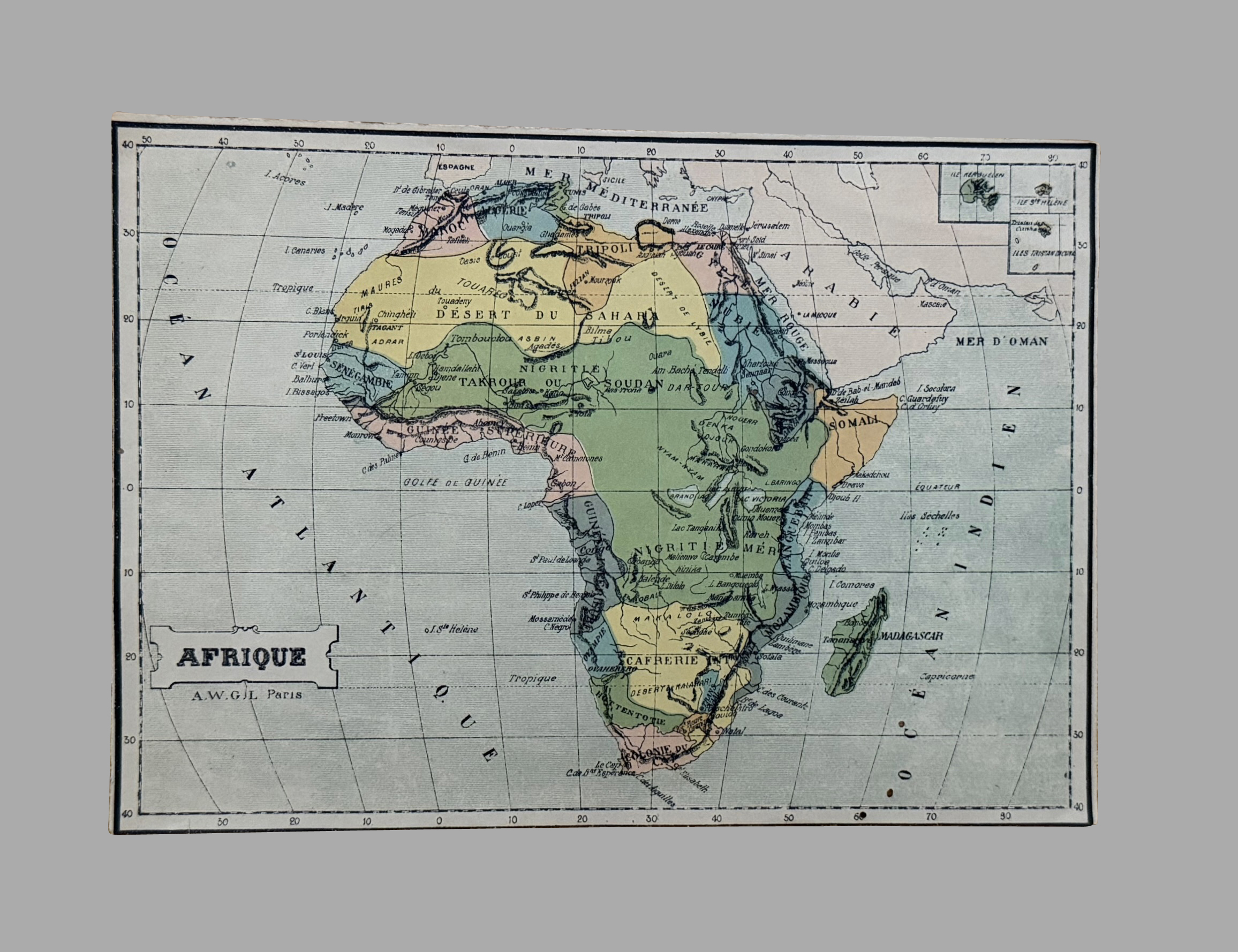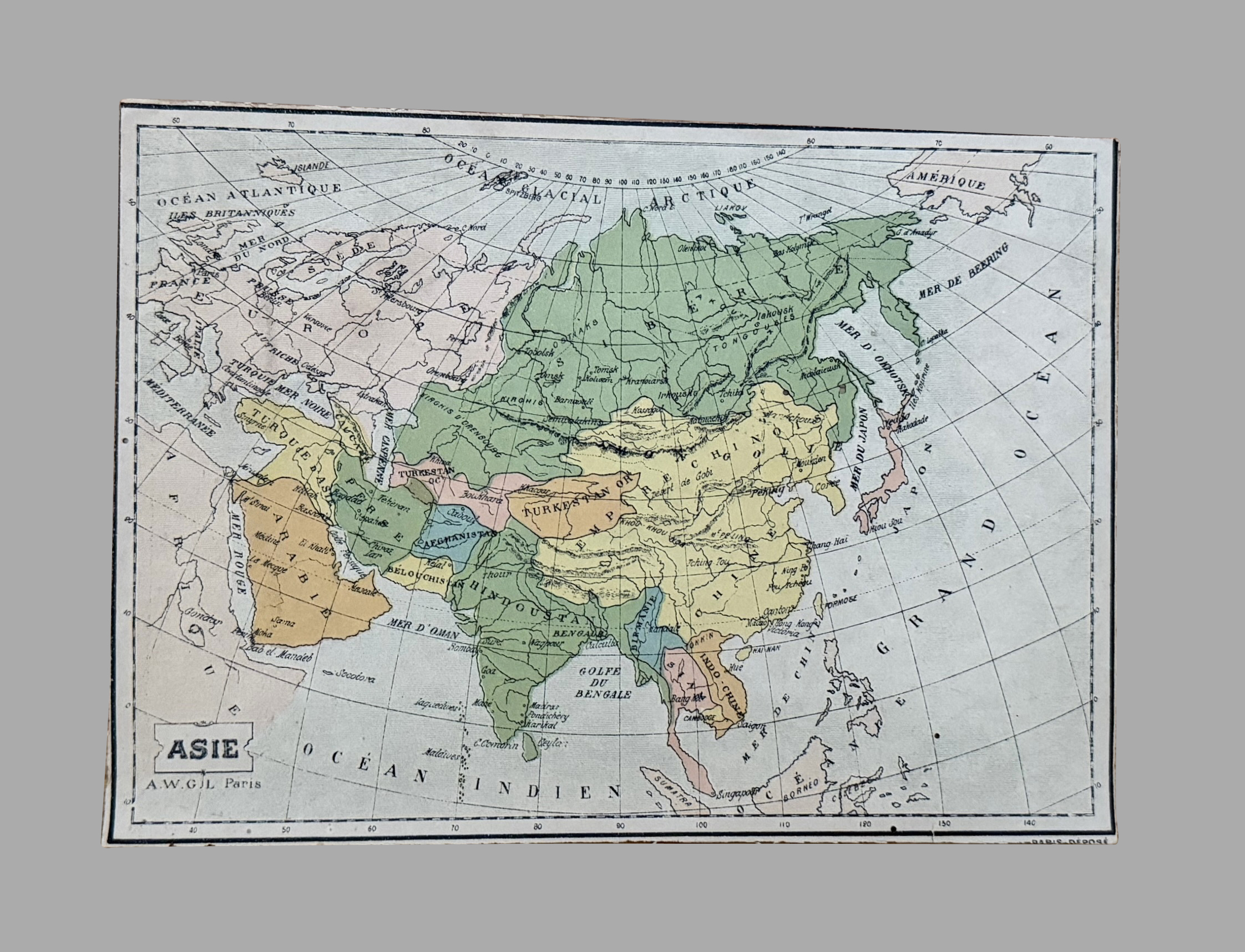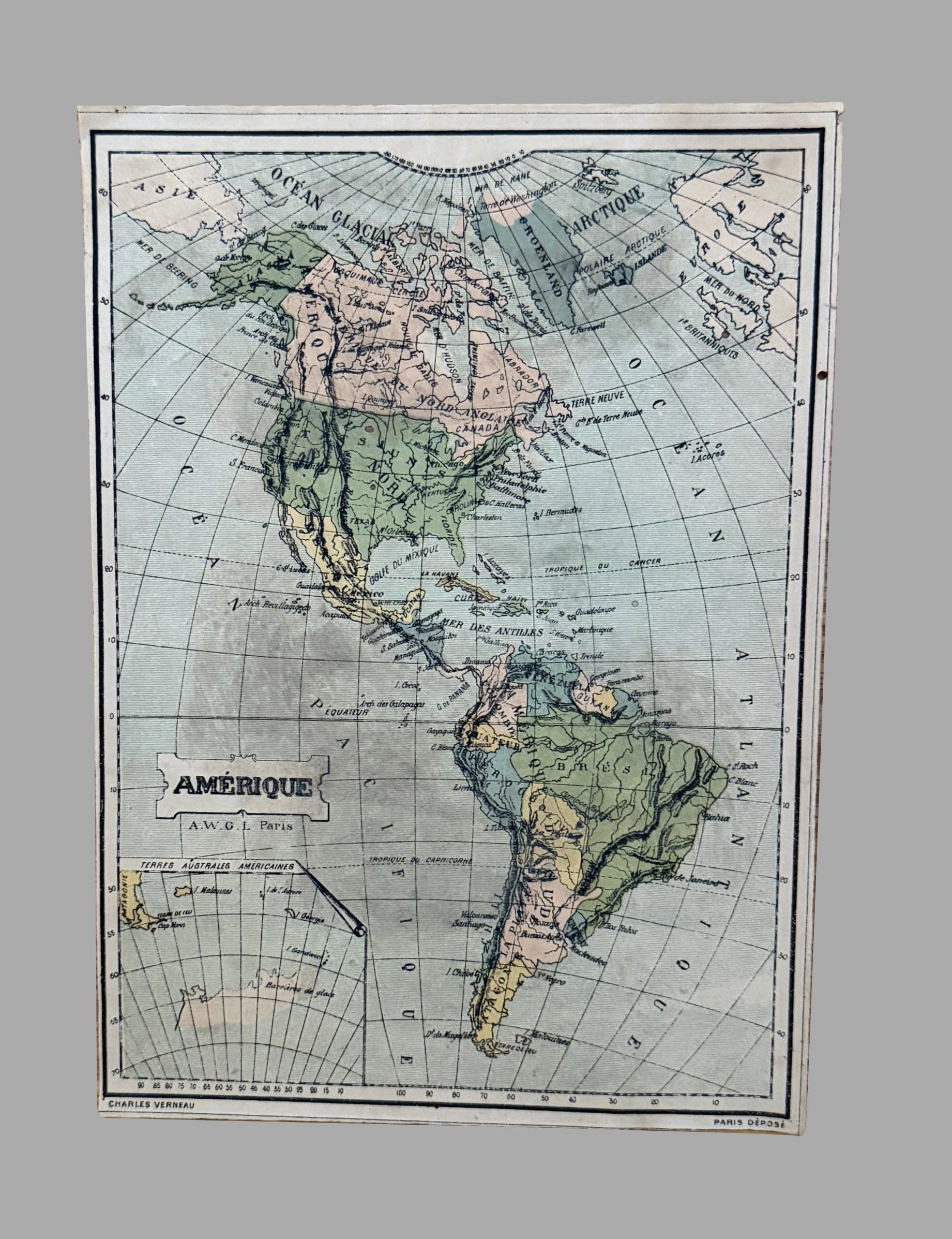 An antique French puzzle box containing 35 cubes which can be assembled into maps of Asia, Africa, North and South America, Europe, France, and the world. The box also contains six paper maps which serve as guides for correctly placing the blocks. Signed by A. W. G. L. which stands for the late 19th century map publishers Alphonse Wogue and his partner G. Levy. They worked in Paris in the late 19th century. Circa 1880.