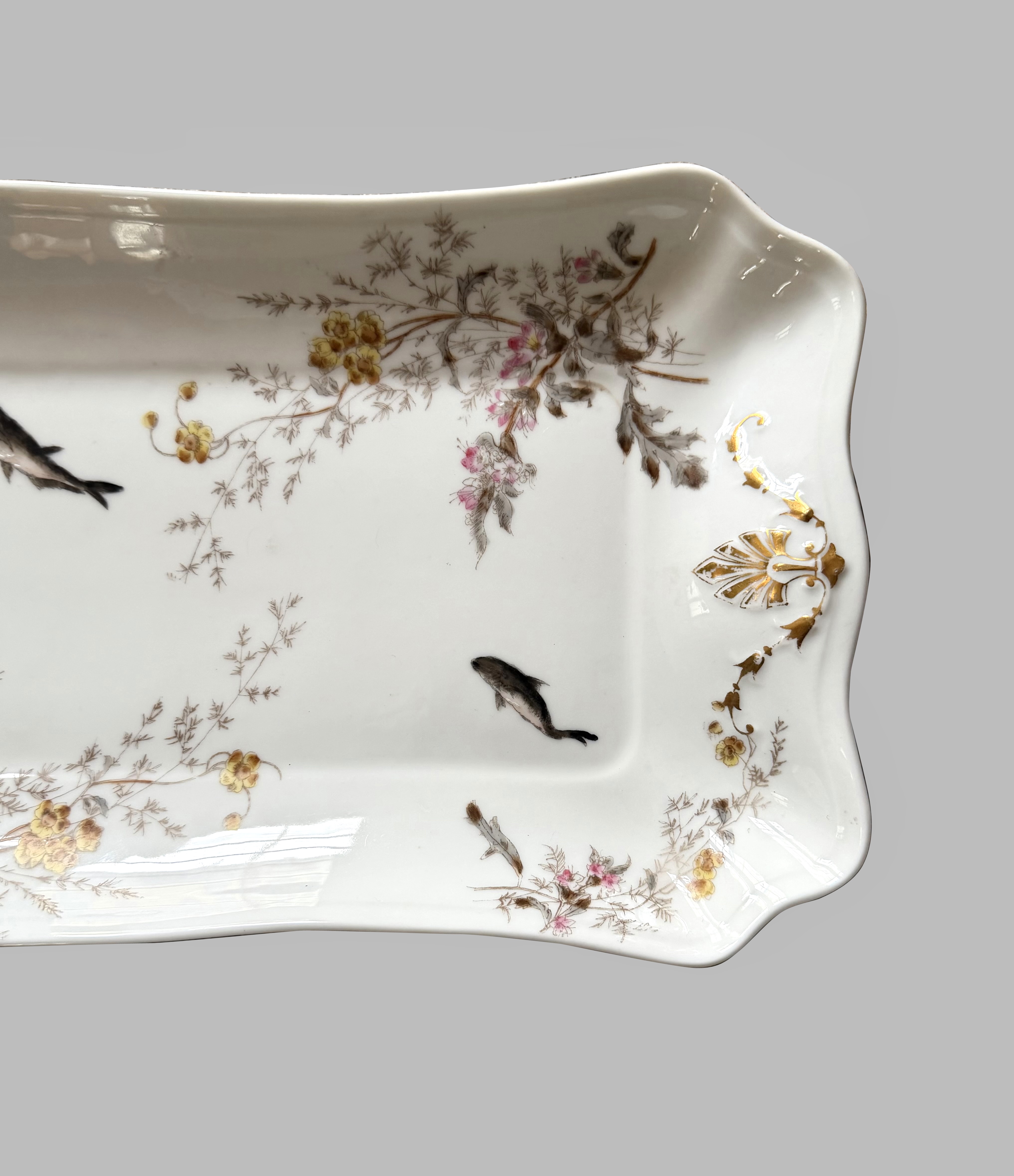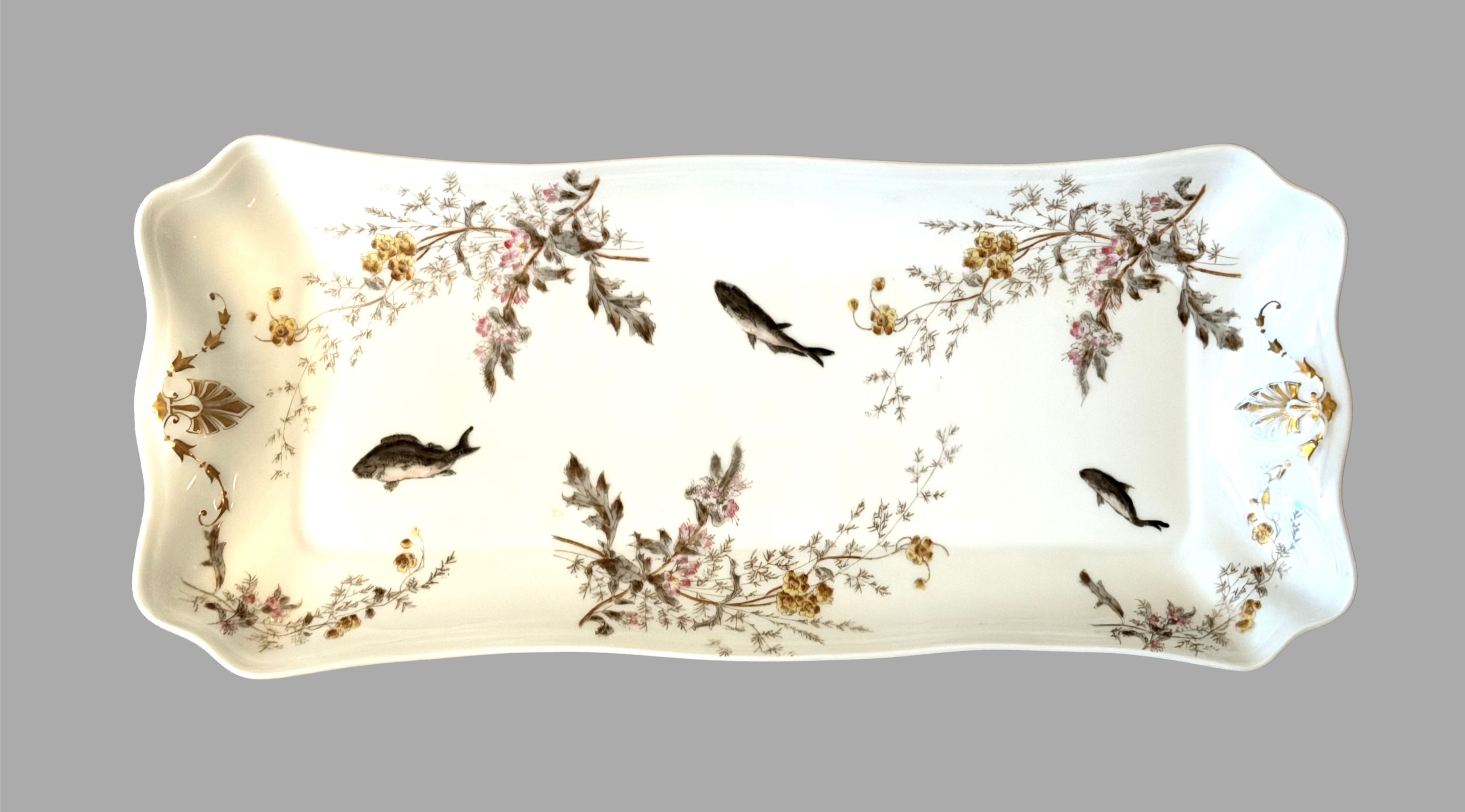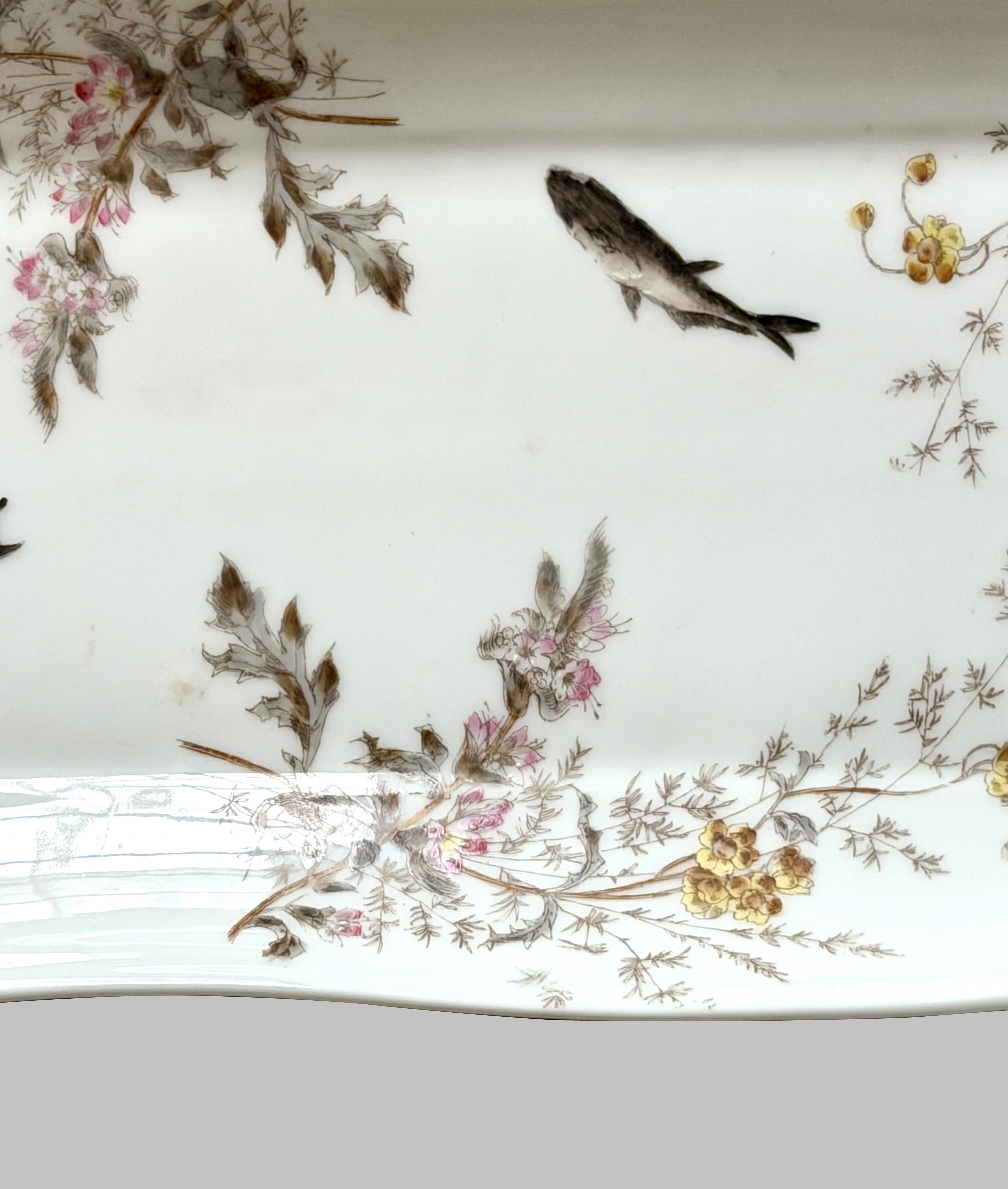 A pretty late 19th century Haviland Limoges hand painted fish platter fully signed and stamped on the back. The piece a charming depiction of swimming fish amidst colorful flora. The ends are gilt decorated .