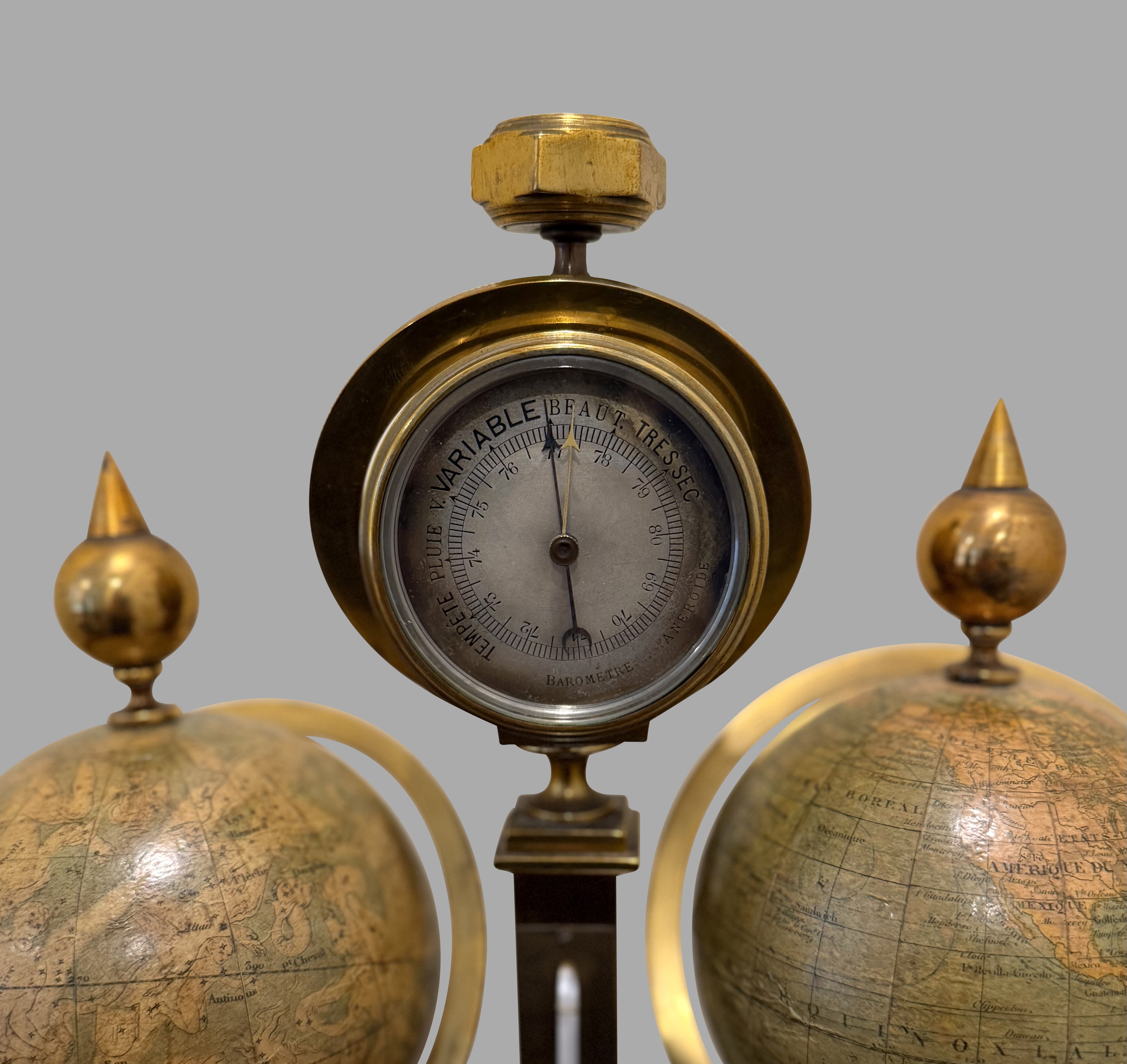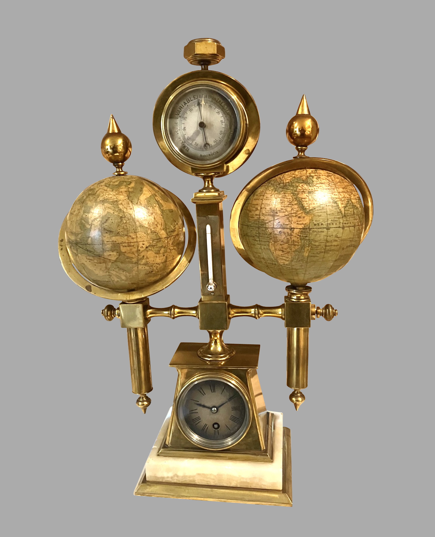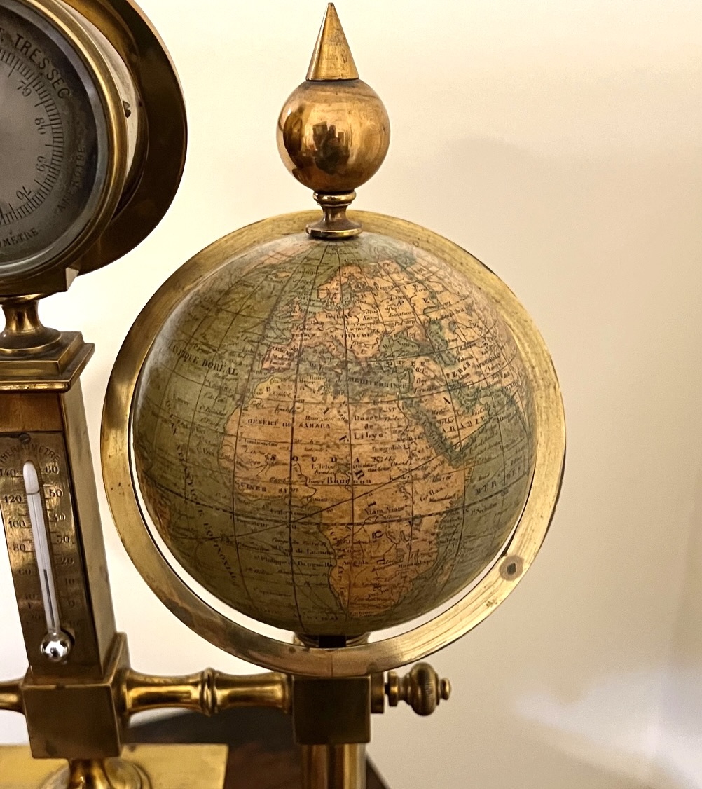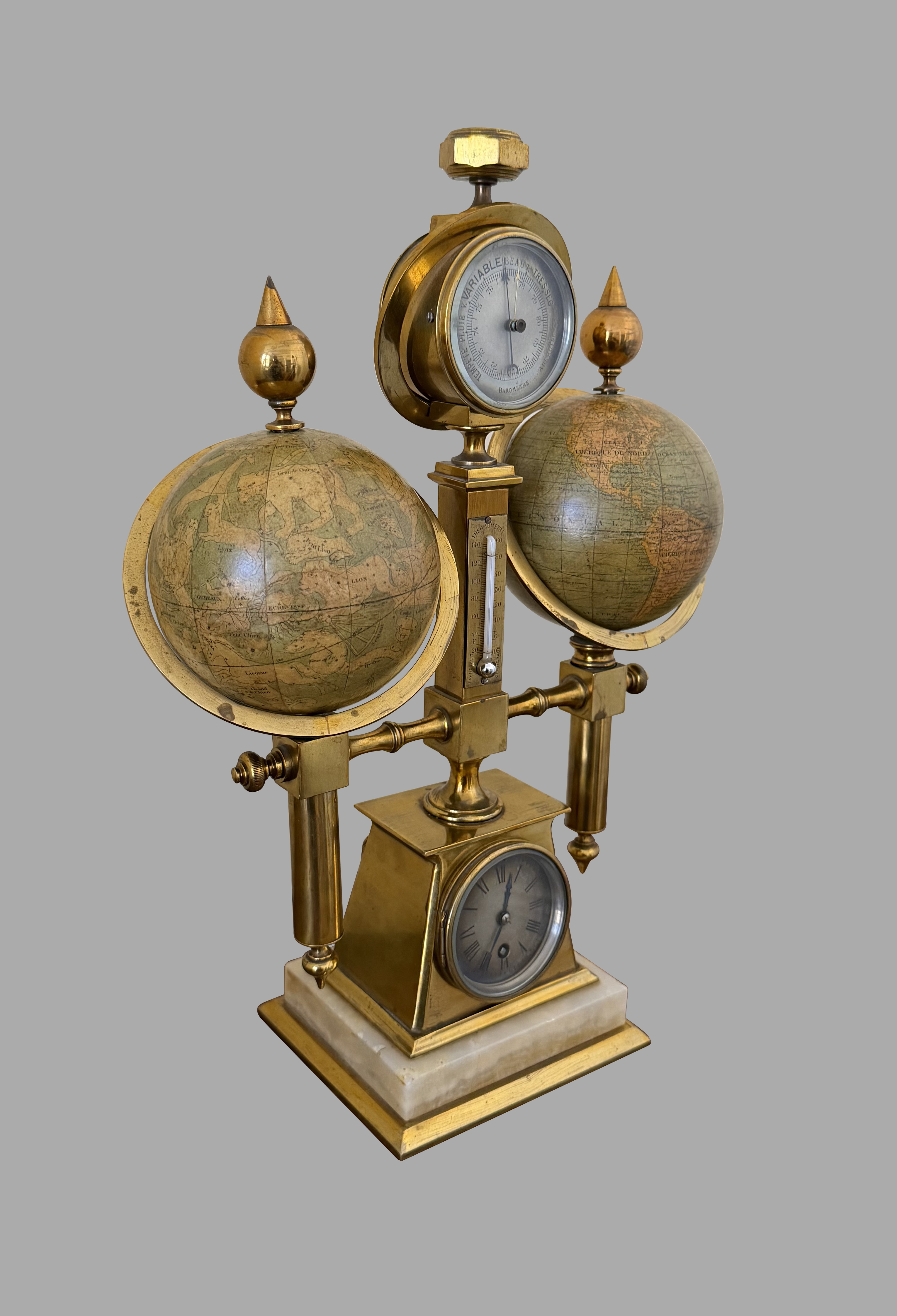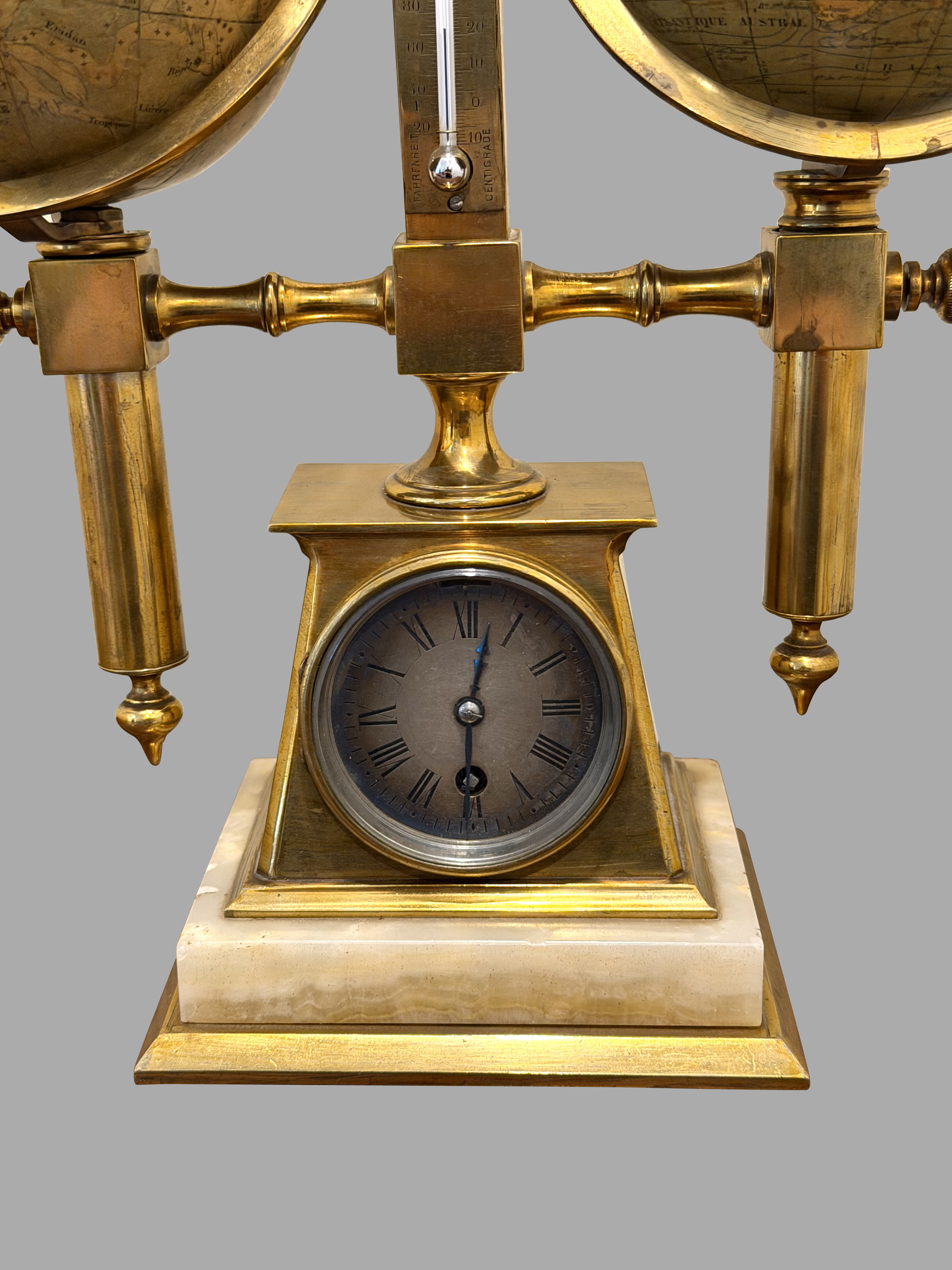 A wonderful French brass and onyx compendium with celestial and terrestrial globes of approximately 3.5" diameter, the celestial signed "Delamarche Paris", the terrestrial signed "E. Bertaux Paris" flanking silvered barometer and thermometer dials, a silvered Roman time dial and a small compass. The entire piece is mounted on a tapering heavy brass base. Delamarche and Bertaux were both very well regarded globe makers in the 19th century.
