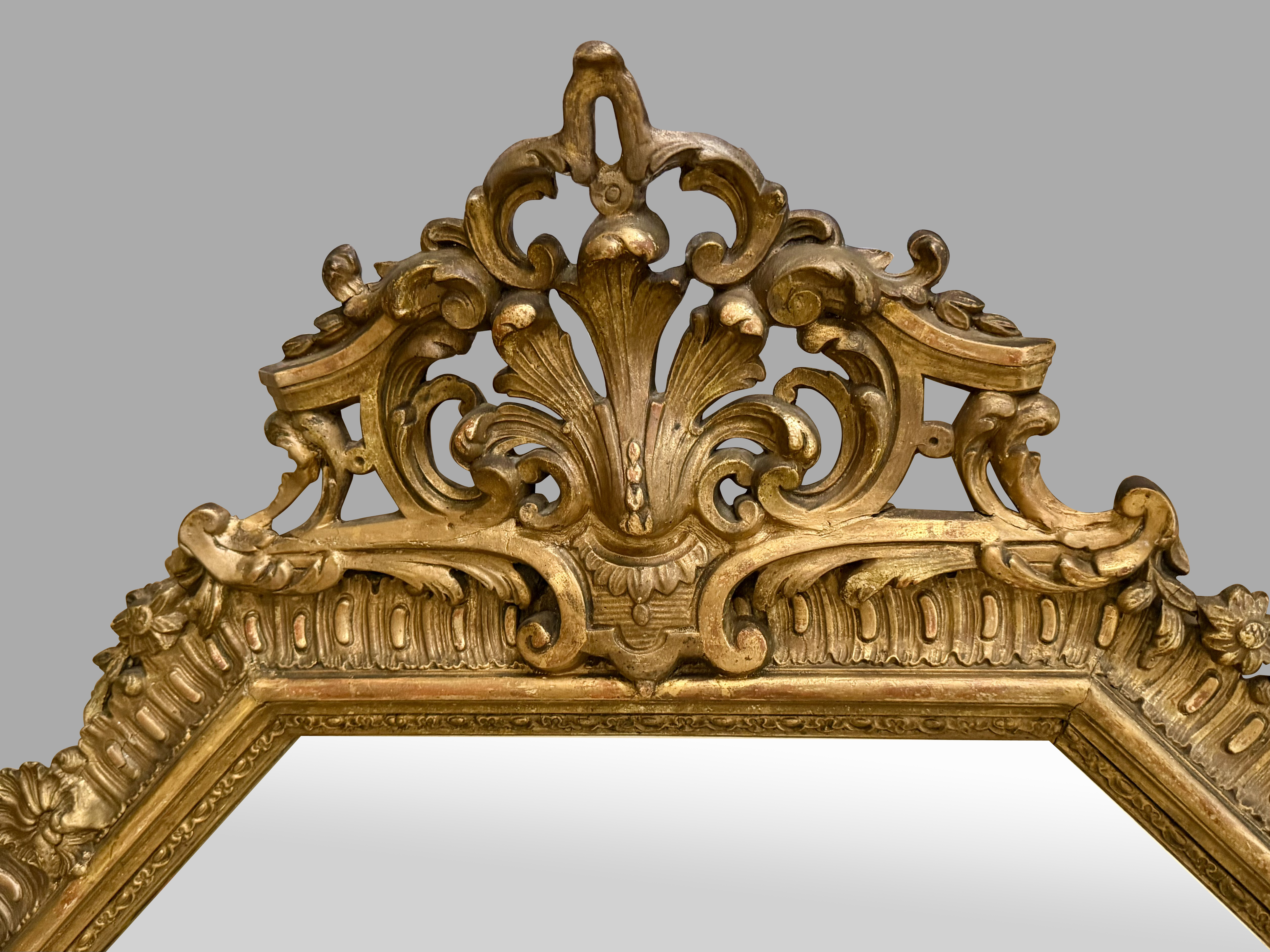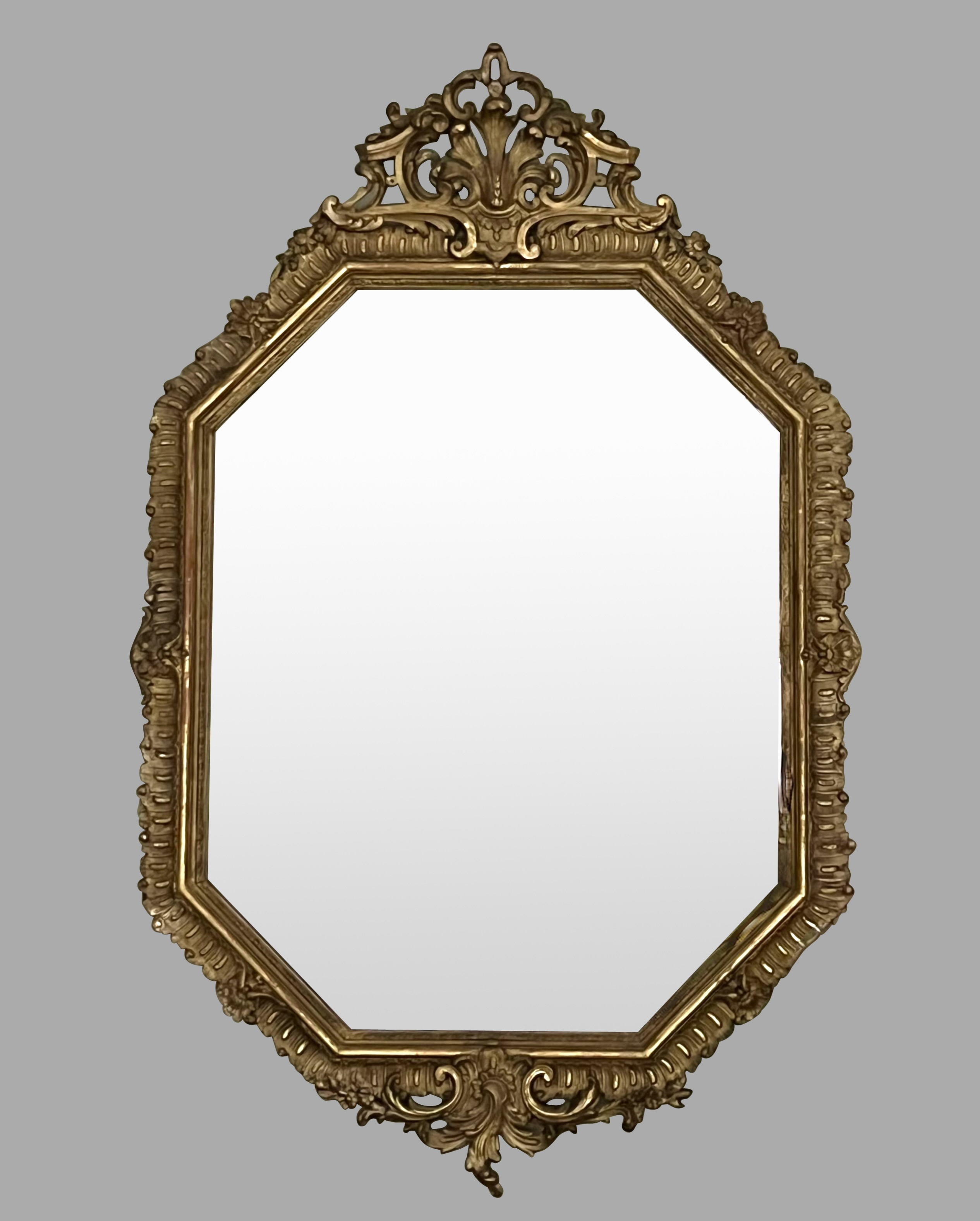 A lovely French Louis XV style giltwood mirror of octagonal form with a stylized fleur-de-lis central cresting retaining an old, possibly original, mirror plate. The piece is well scaled for multiple possible placements. In very attractive orginal condition. Circa 1890-1900.