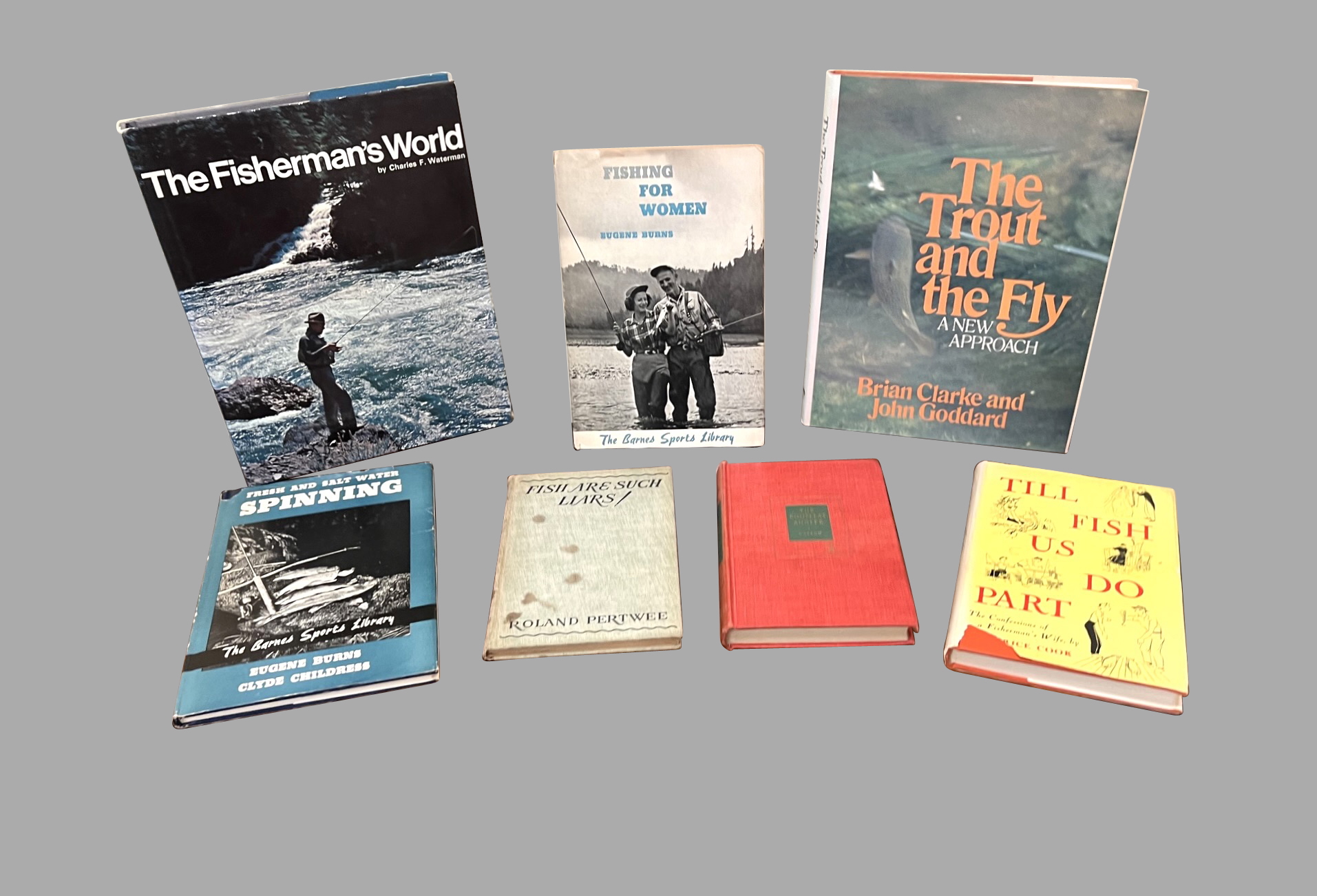 A group of seven books on fishing as follows: • The Fisherman's World by Charles Waterman published Random House, no date • The Trout and the Fly by Clarke and Goddard published Doubleday & Co., 1980 • Fishing for Women by Eugene Burns published A.S. Barnes & Co., 1953 • Fresh and Saltwater Spinning by Burns and Childress published A.S. Barnes & Co., 1952 • Til Fish Do Us Part by Beatrice Cook published William Morrow & Co., 1949 • The Compleat Angler by Izaak Walton published The Modern Library, circa 1950 • Fish Are Such Liars by Roland Pertwee published Houghton Mifflin & Co., 1928