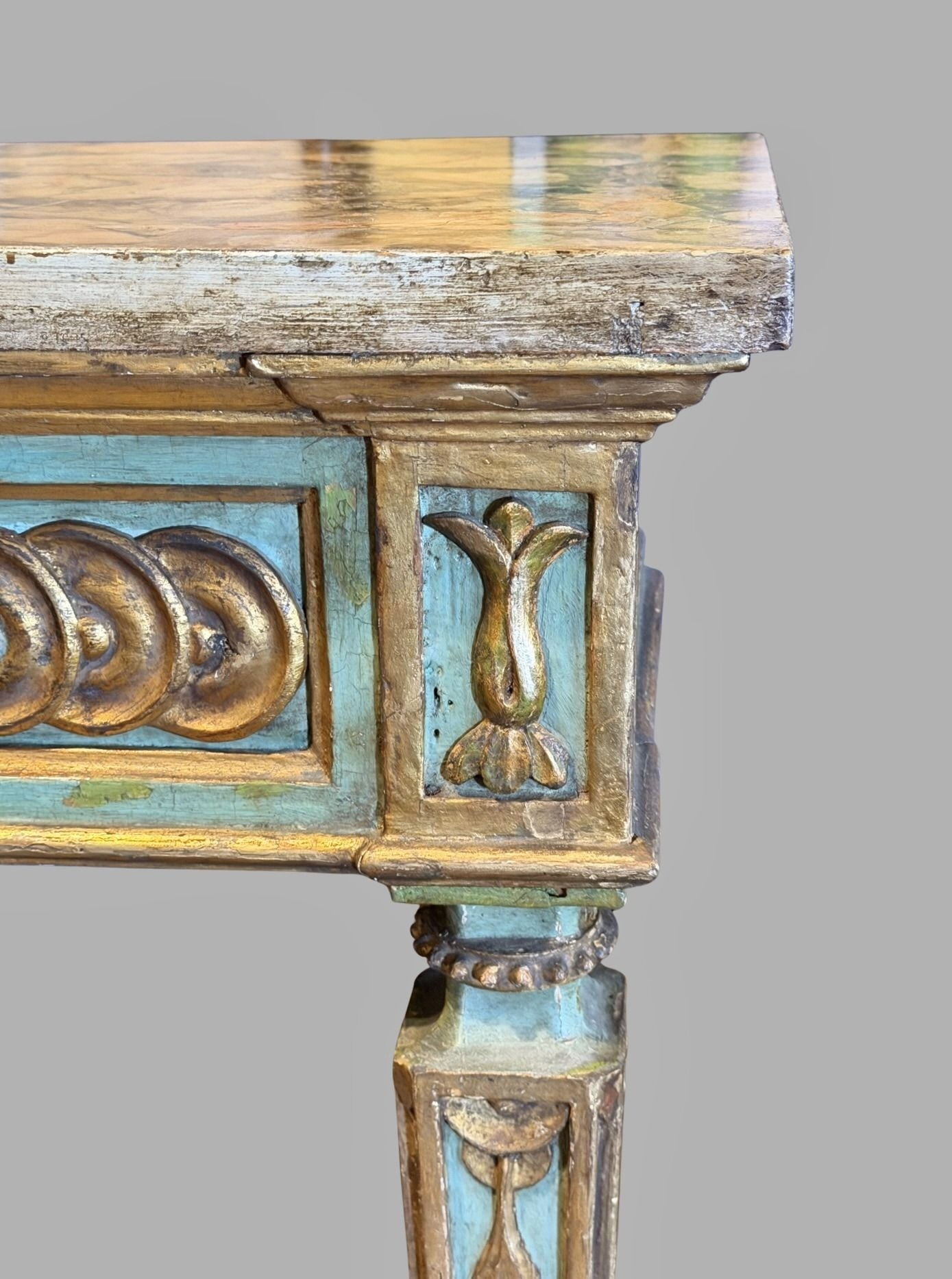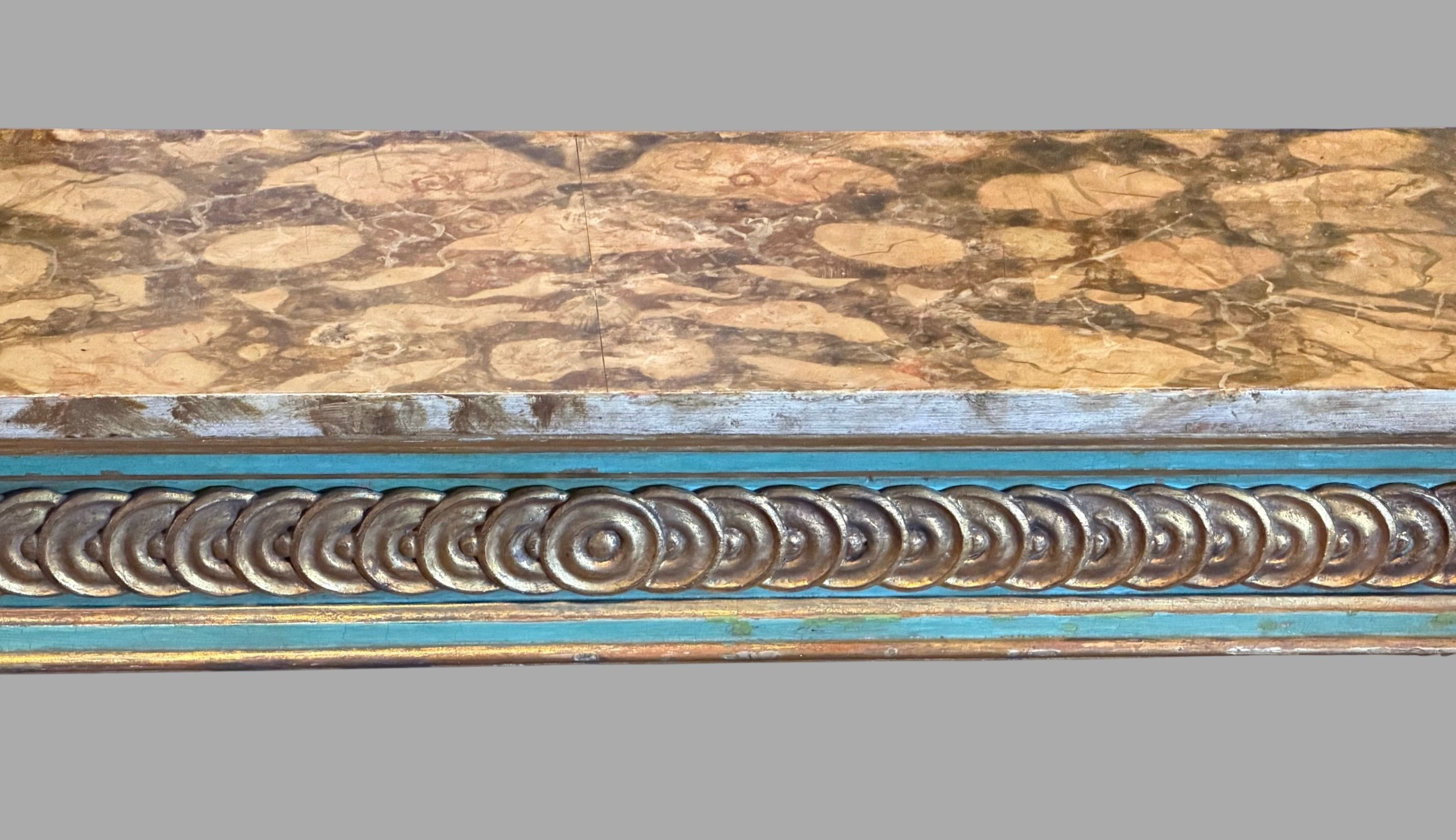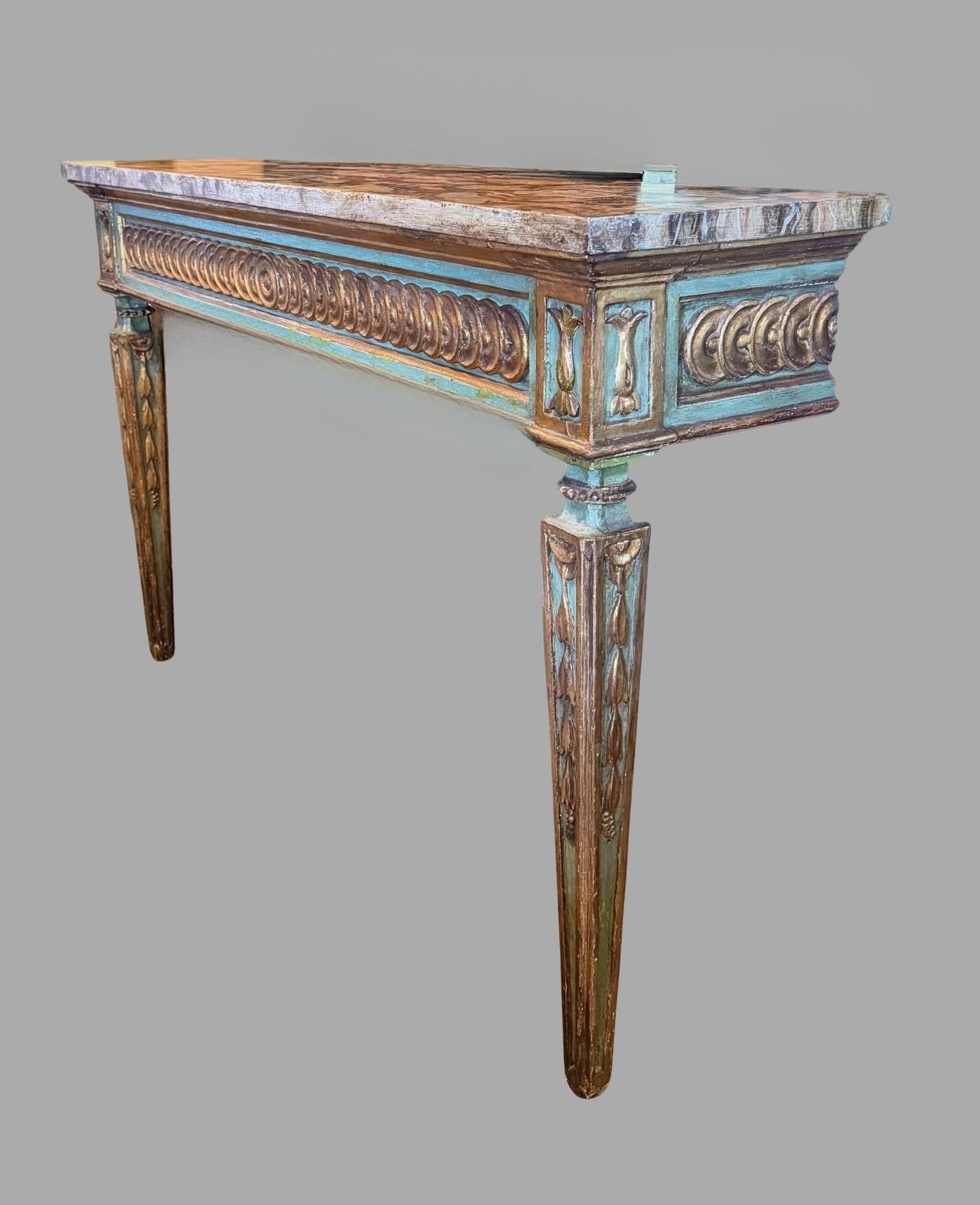 A pretty Italian Neoclassical period console table painted in tones of aquamarine and gold with a grey and cream variegated faux marble top.This is a stylish and quite narrow table perfect for an entry hall. Possibly altered from a larger table. Circa 1790y)