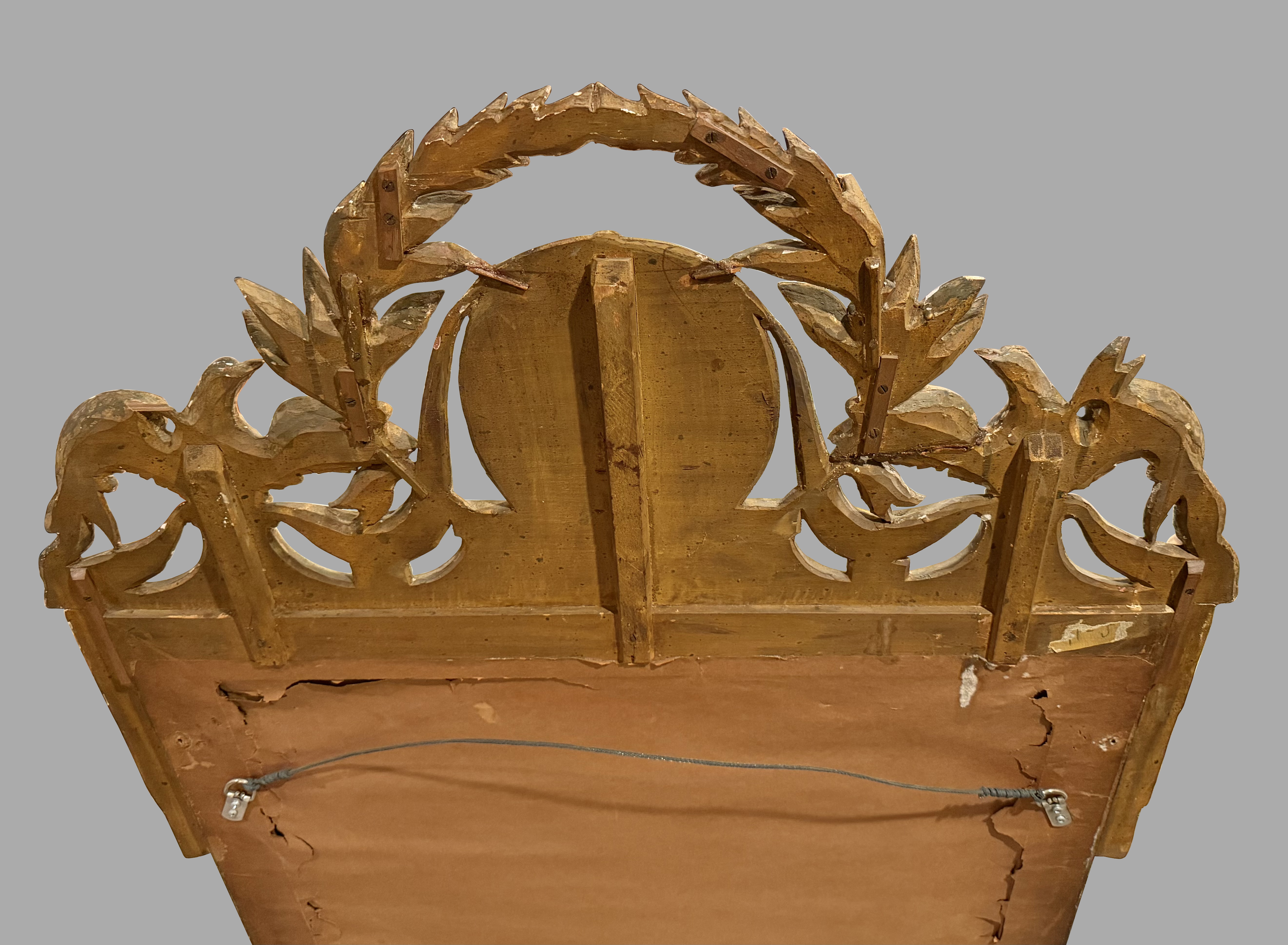 A very pretty Italian Neoclassical mirror of rectangular form, the elaborate cresting centered with a wheat sheath gilded oval panel framed by a laurel canopy, further flanked by 2 gilded eagles. The mirror plate is framed with a pastel green border with beaded inset. Retains an old mirror, possibly original. Nineteenth century.