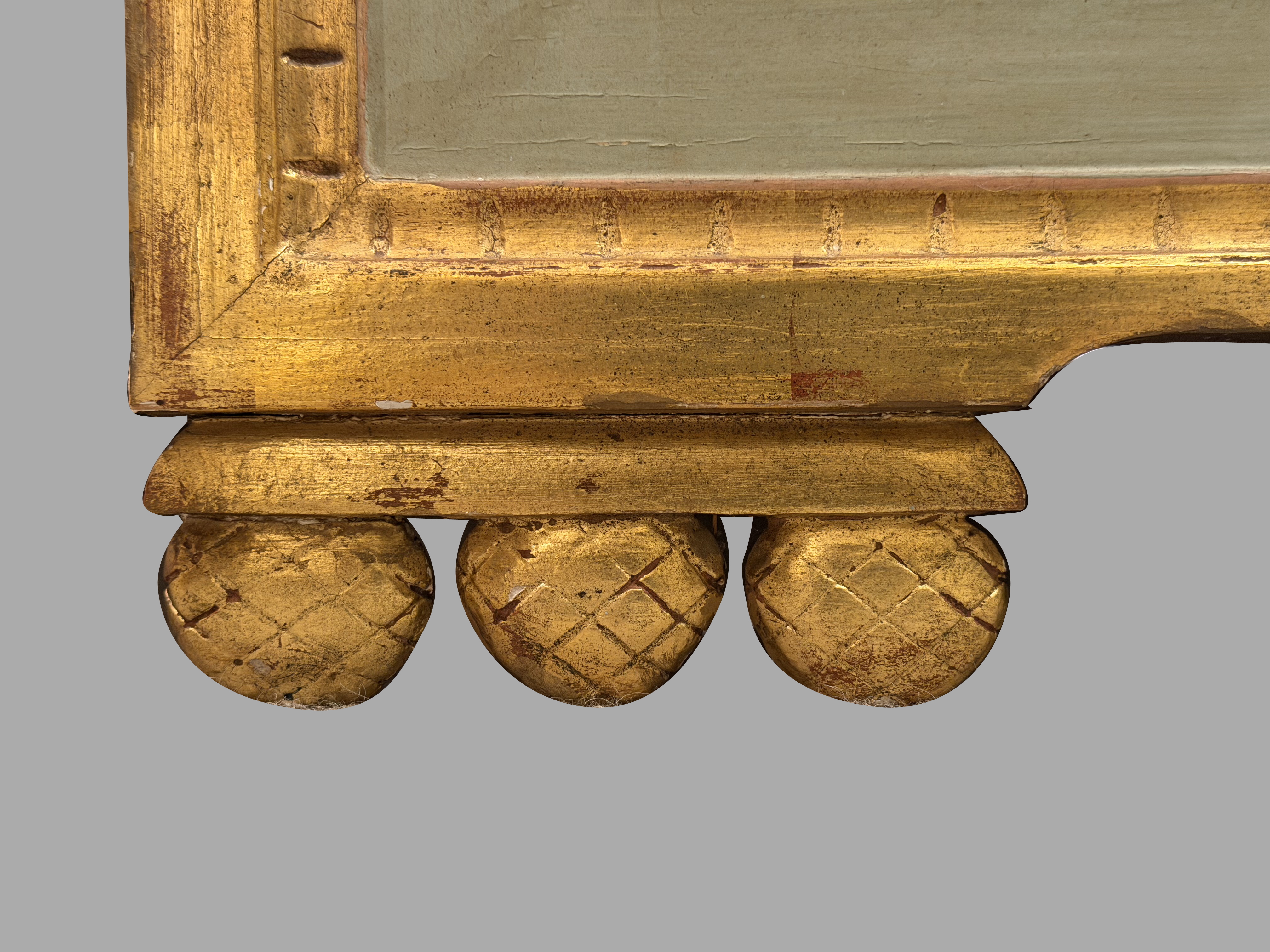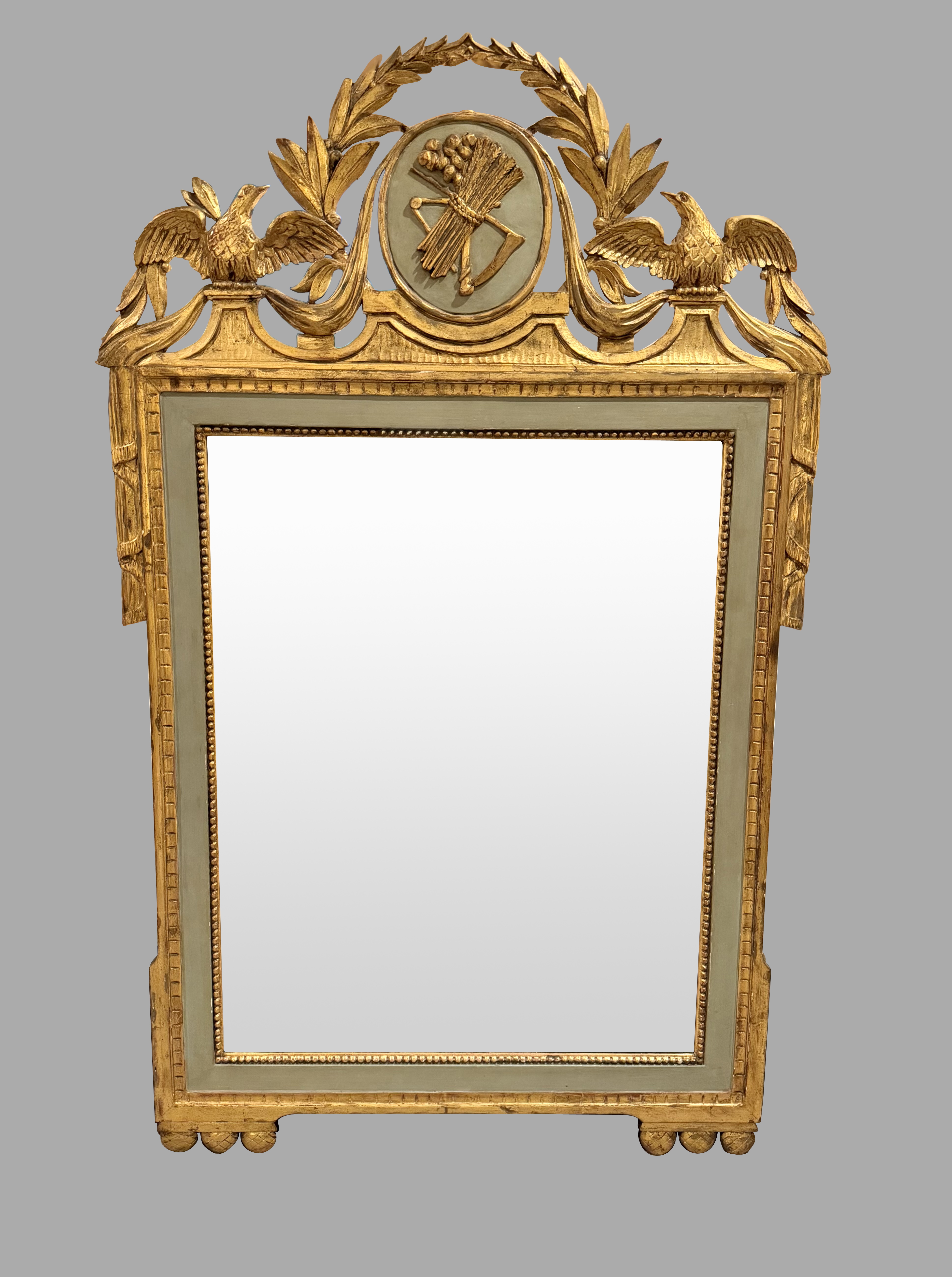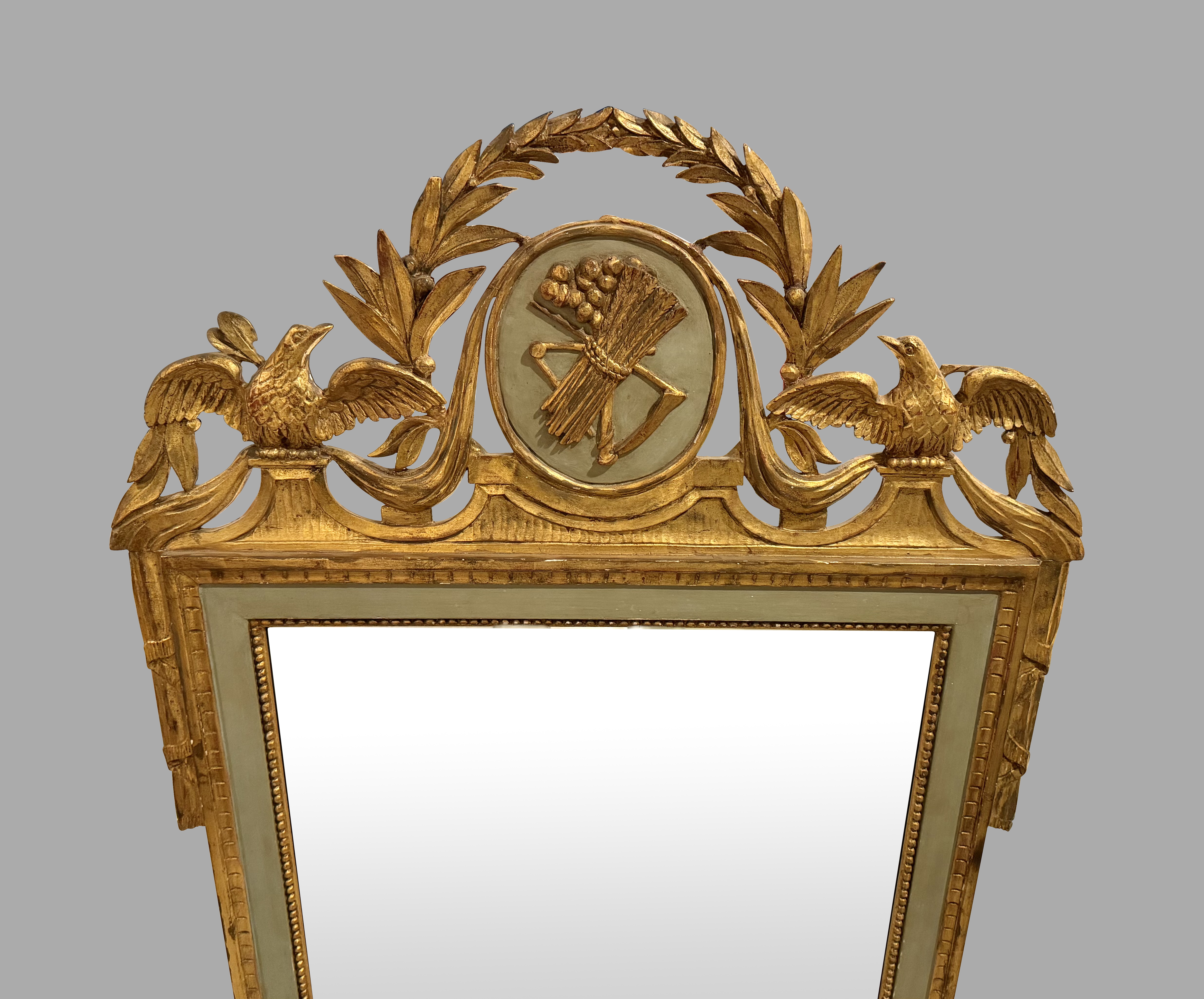 A very pretty Italian Neoclassical mirror of rectangular form, the elaborate cresting centered with a wheat sheath gilded oval panel framed by a laurel canopy, further flanked by 2 gilded eagles. The mirror plate is framed with a pastel green border with beaded inset. Retains an old mirror, possibly original. Nineteenth century.
