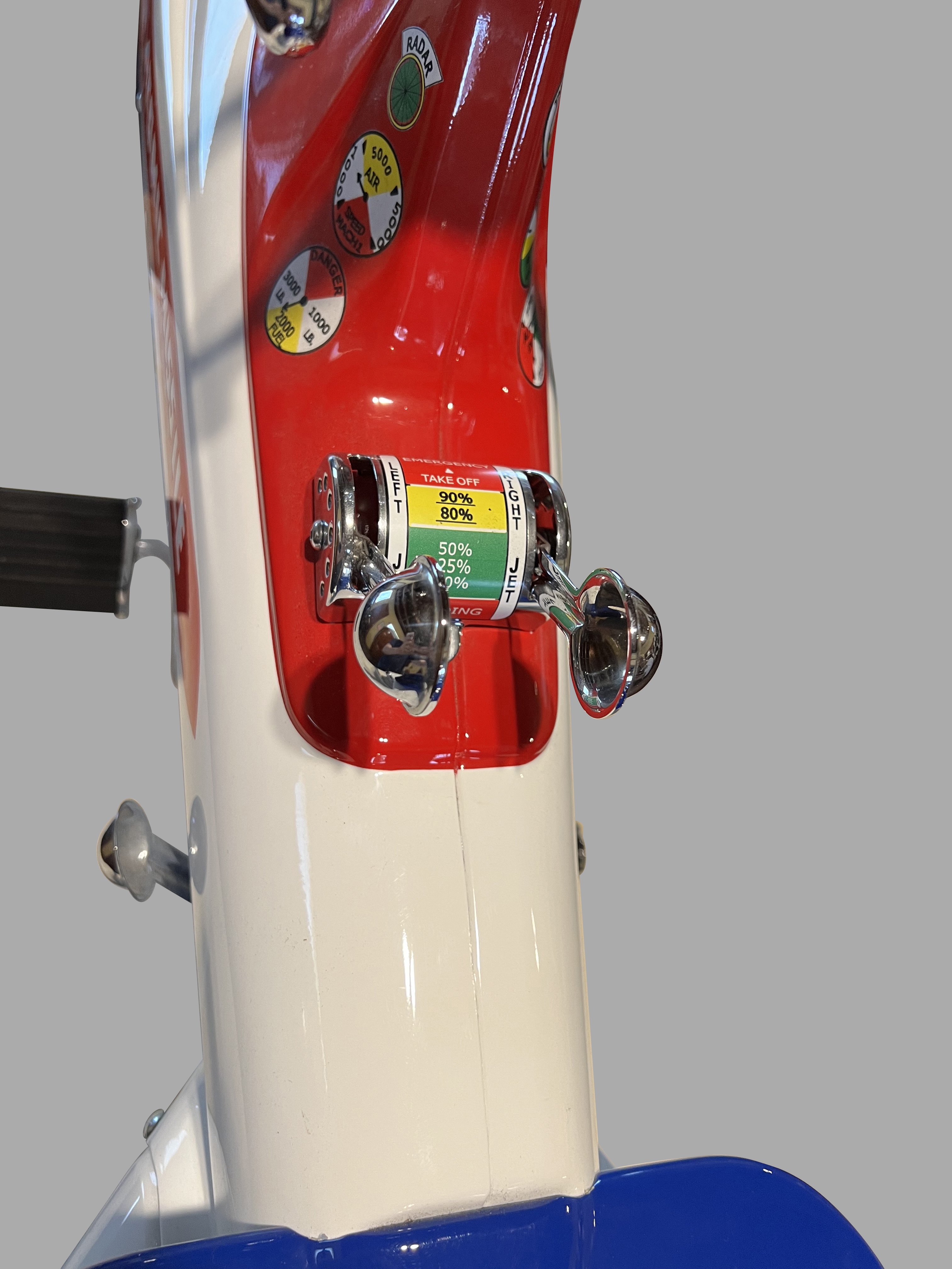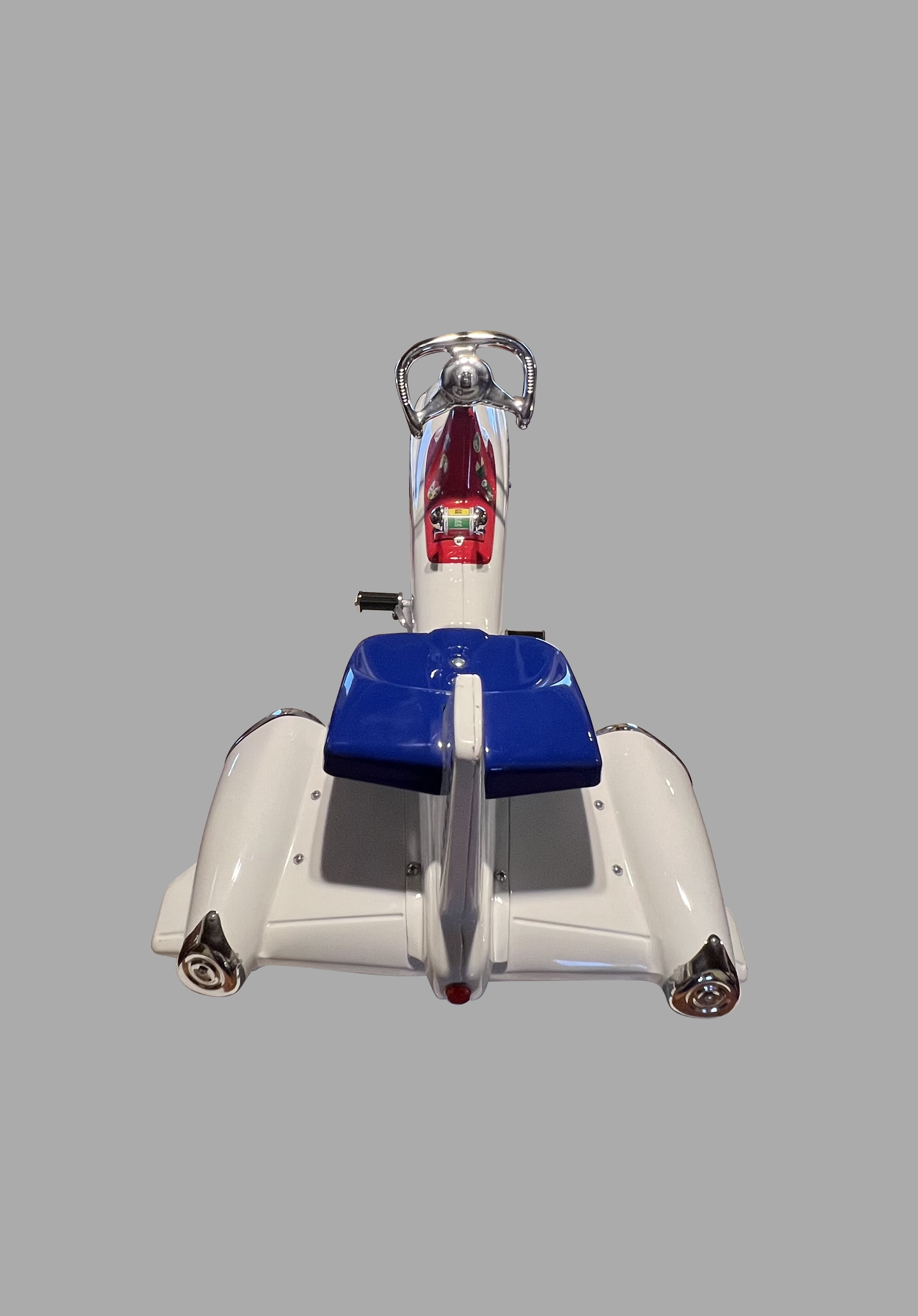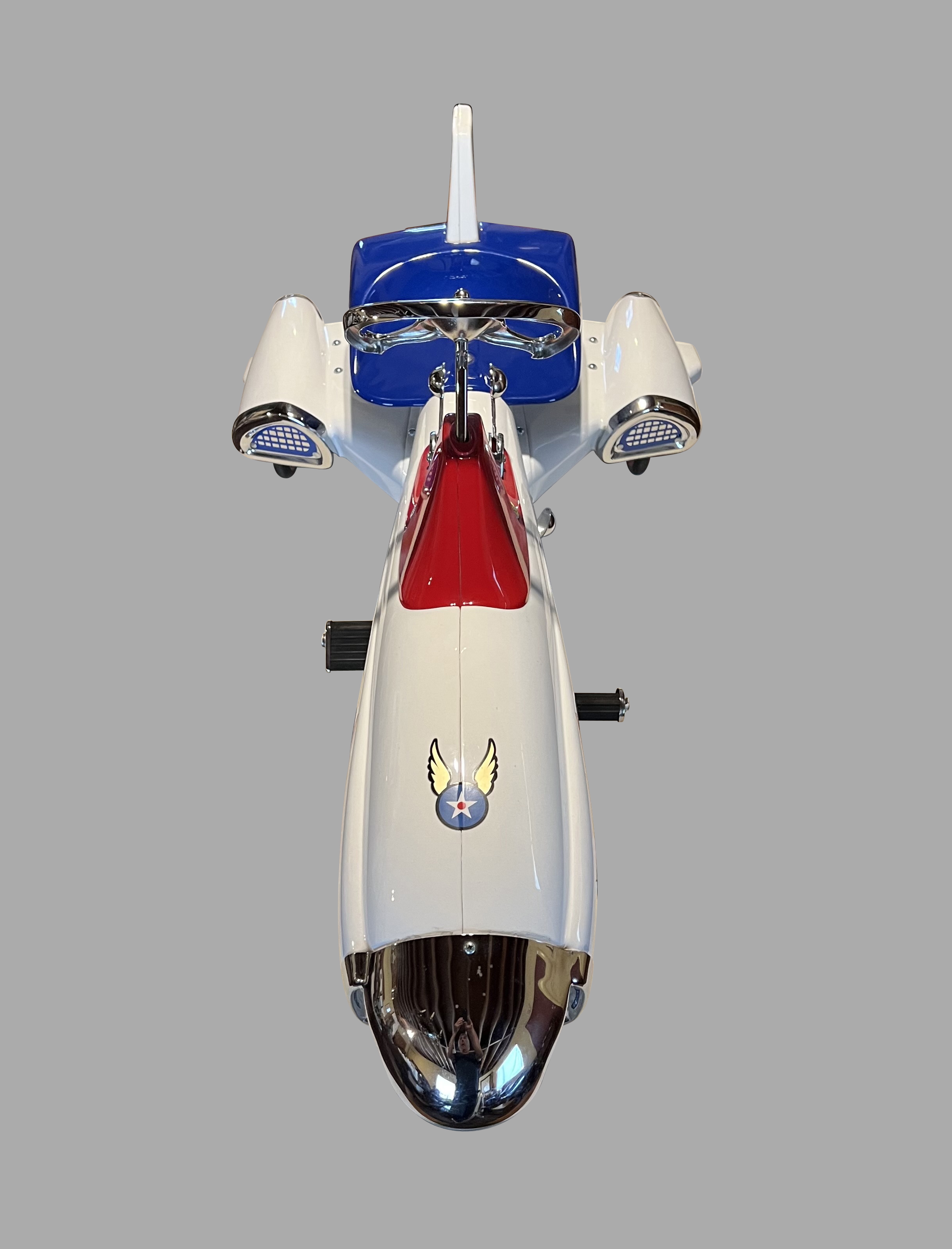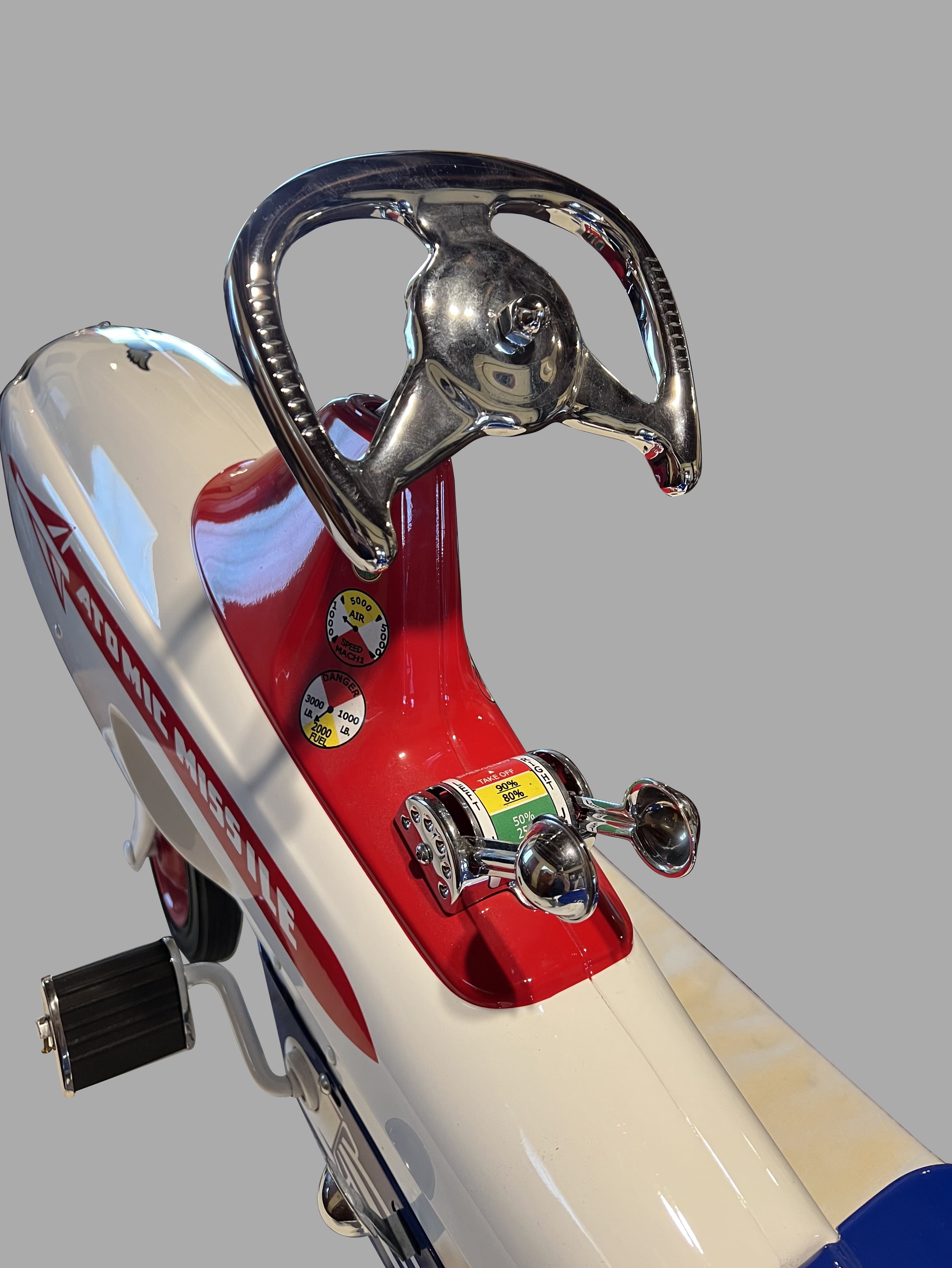 An iconic professionally restored "Murray Atomic Missile" pedal car, produced in the United States in the mid-50's until 1963. The car is a fully functional pedal car with a chain driven mechanism and a yoke steering wheel. It features faux flight instruments, a distinctive fuselage body with delta wings and logos on the tail fin and sides. This example was meticulously and accurately restored within the last 10 years. This is not a reproduction. An interesting and amusing space age relic of the cold war.