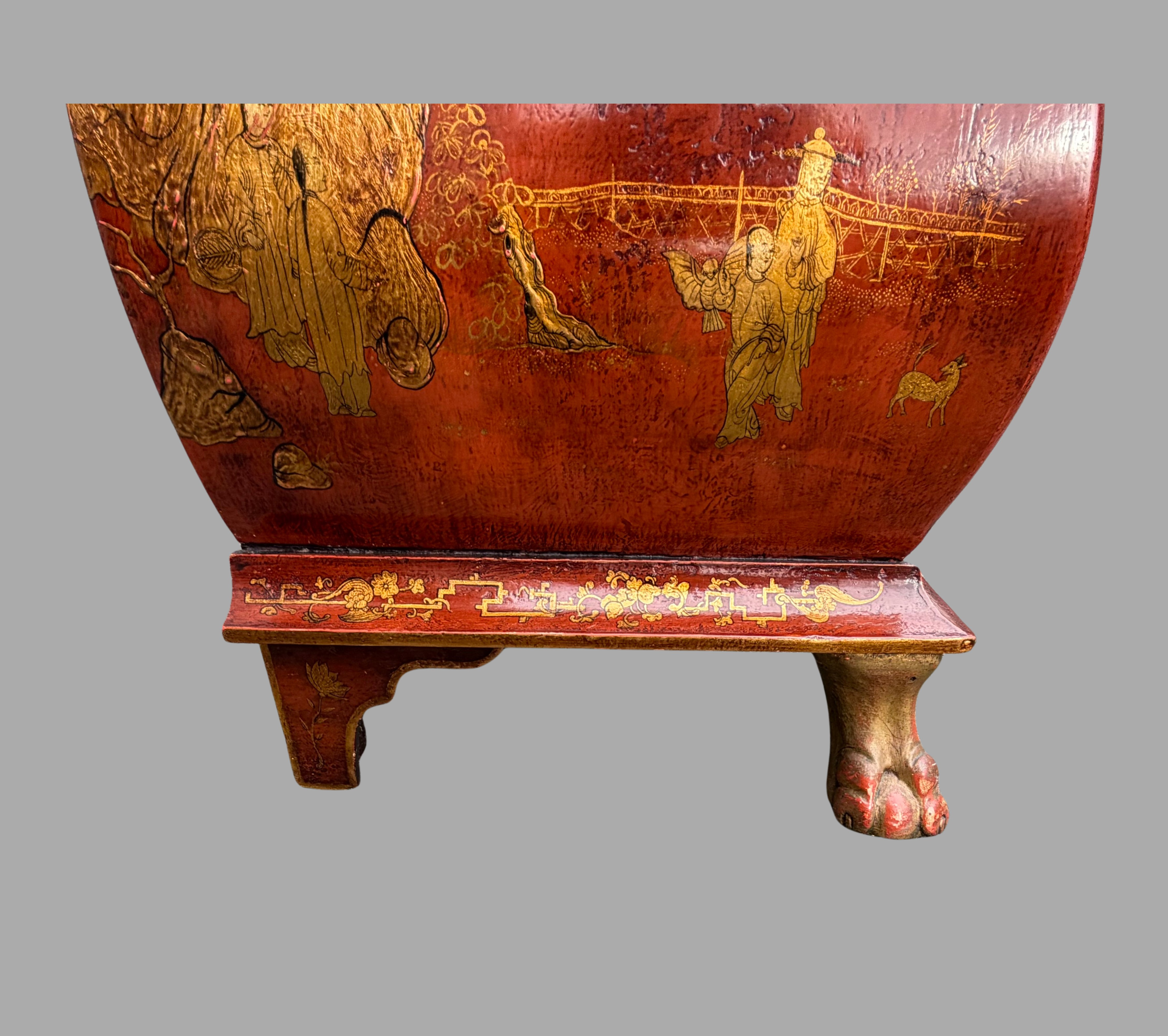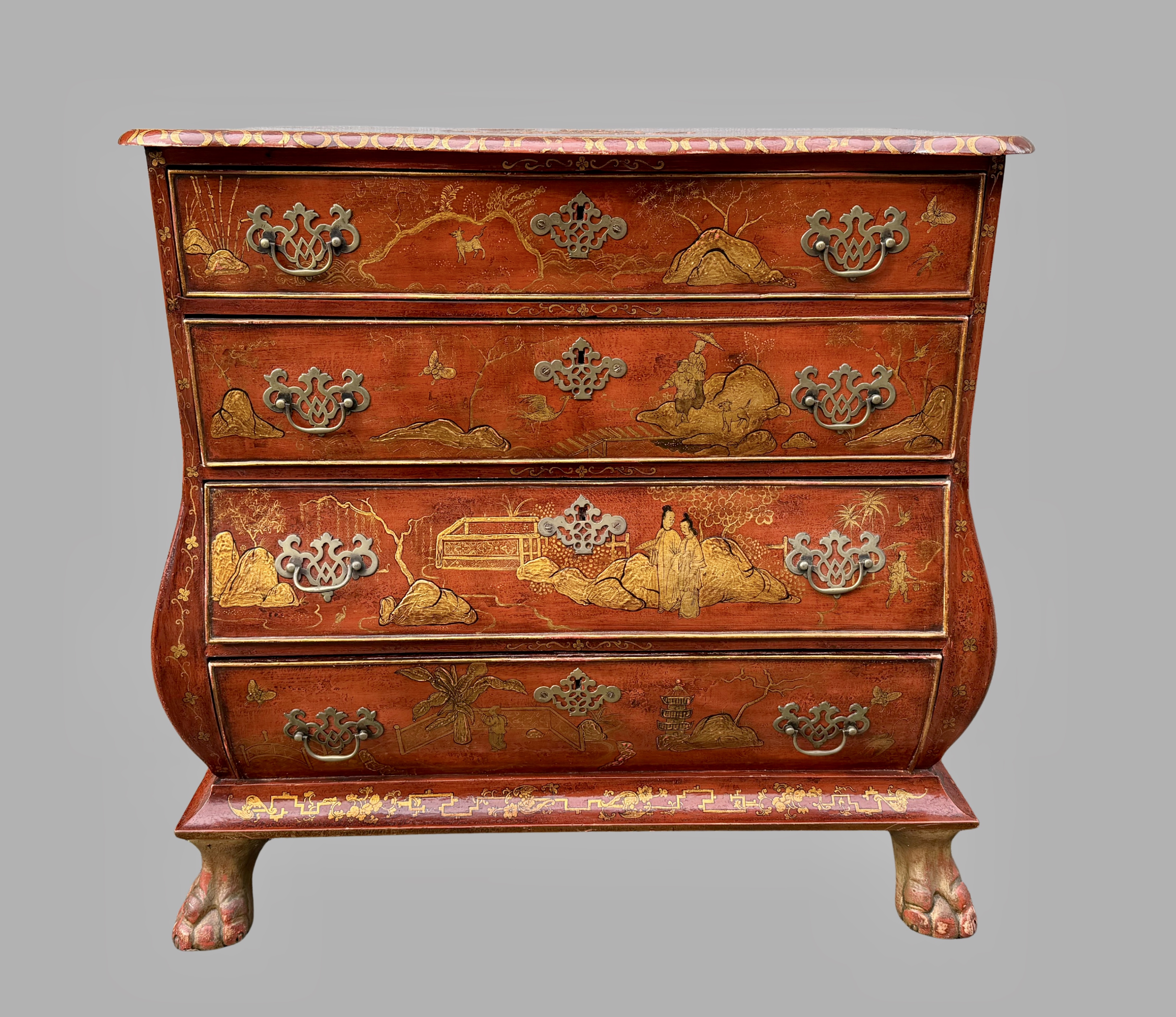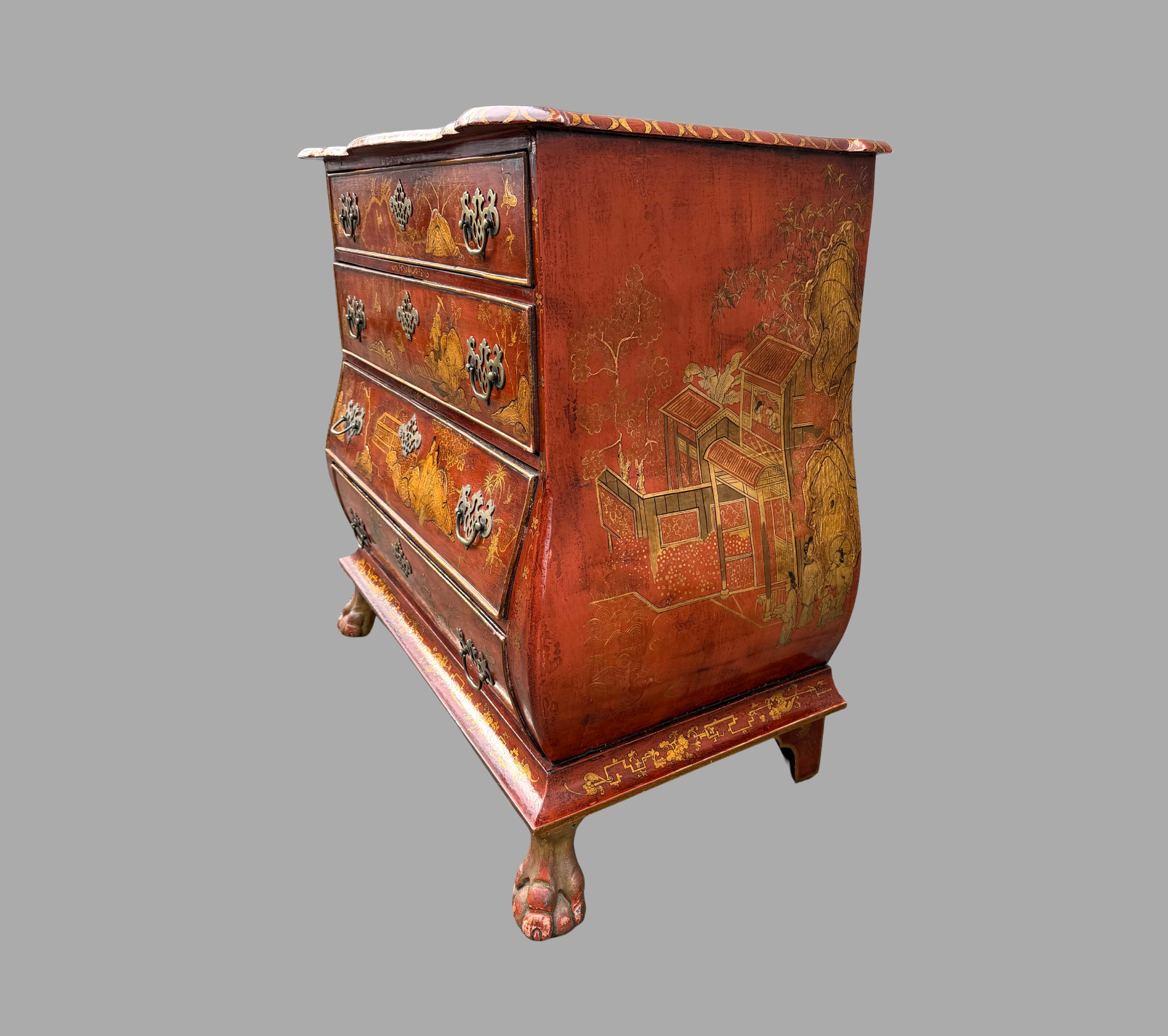 A pretty Anglo-Dutch scarlet japanned bombe form 18th century four drawer chest with a serpentine top. This lovely piece rests on gilt animal paw front feet. The top features a foliate central panel which is framed by a floral edge. The drawer fronts are decorated with elaborate outdoor garden scenes with figures and mountains. The sides are rendered in a similar fashion. This is a dramatic and artistically decorated piece of antique furniture. Japanned decoration of a later date.