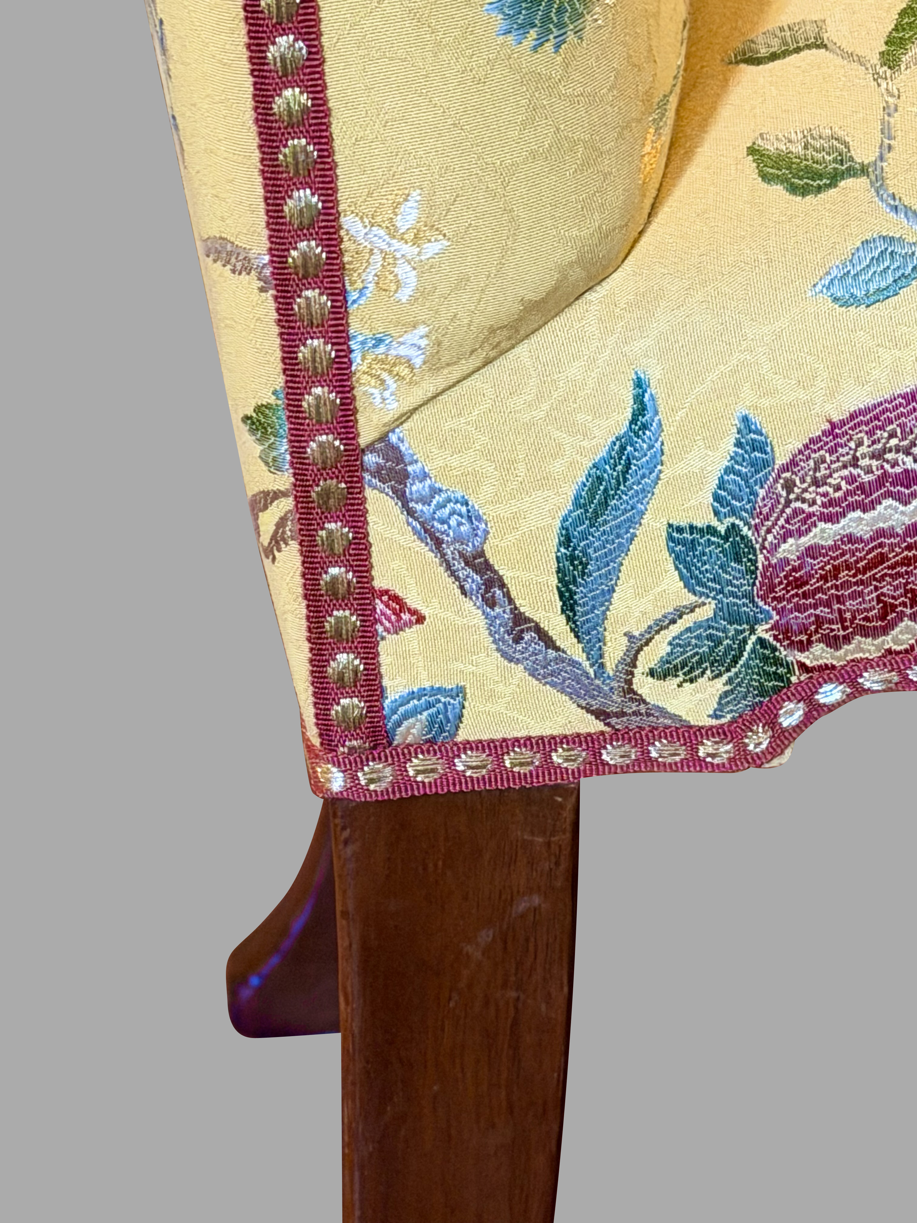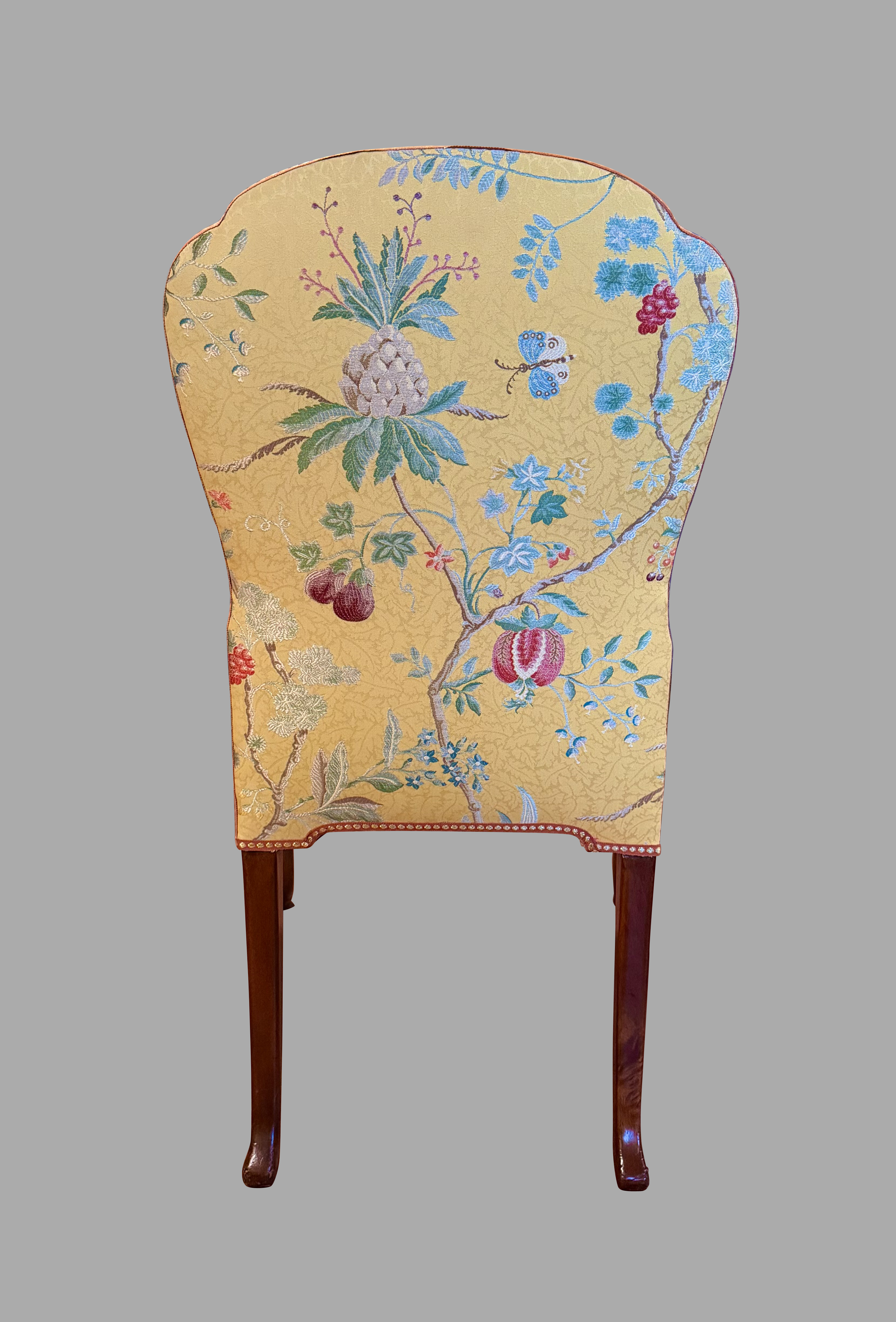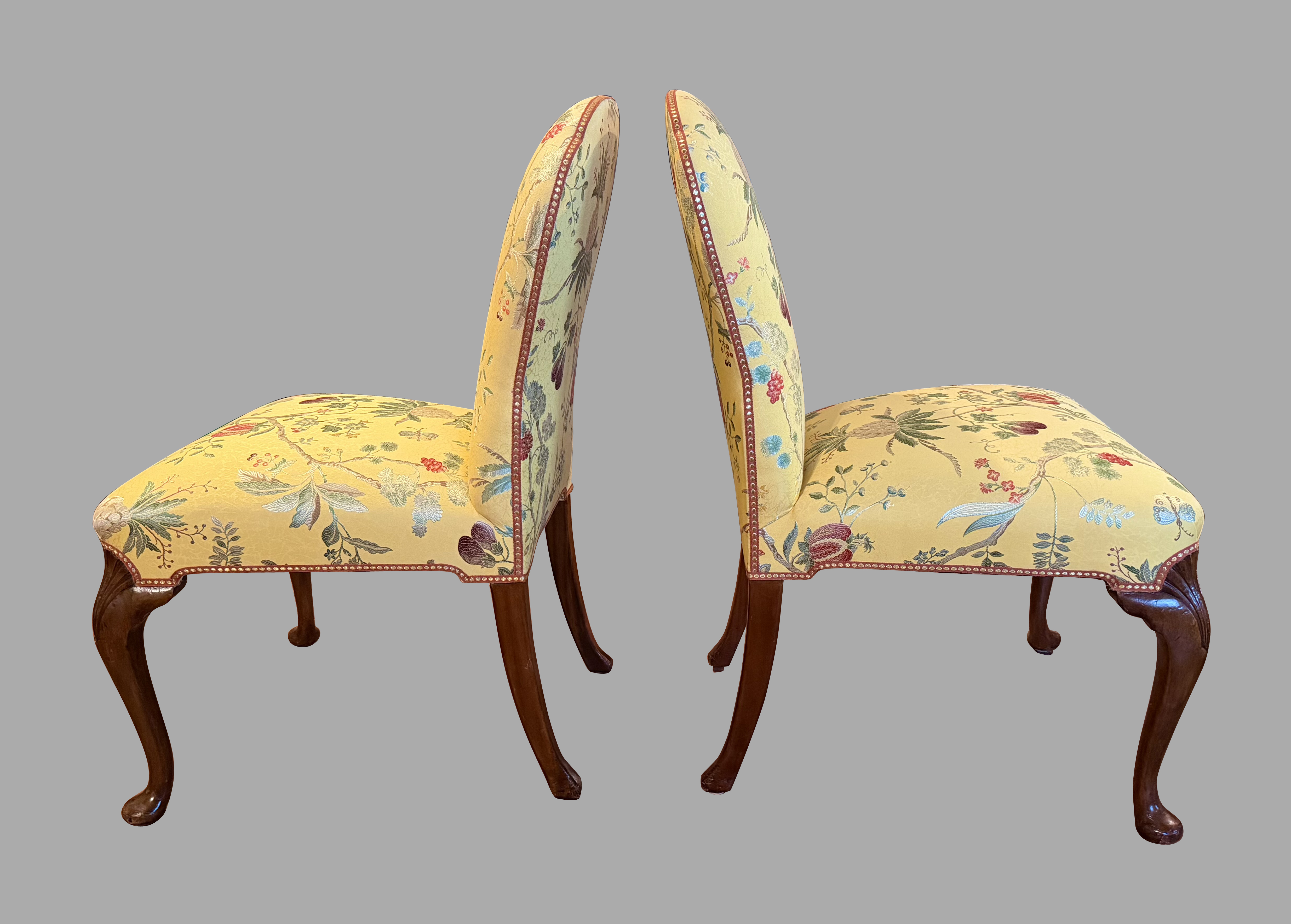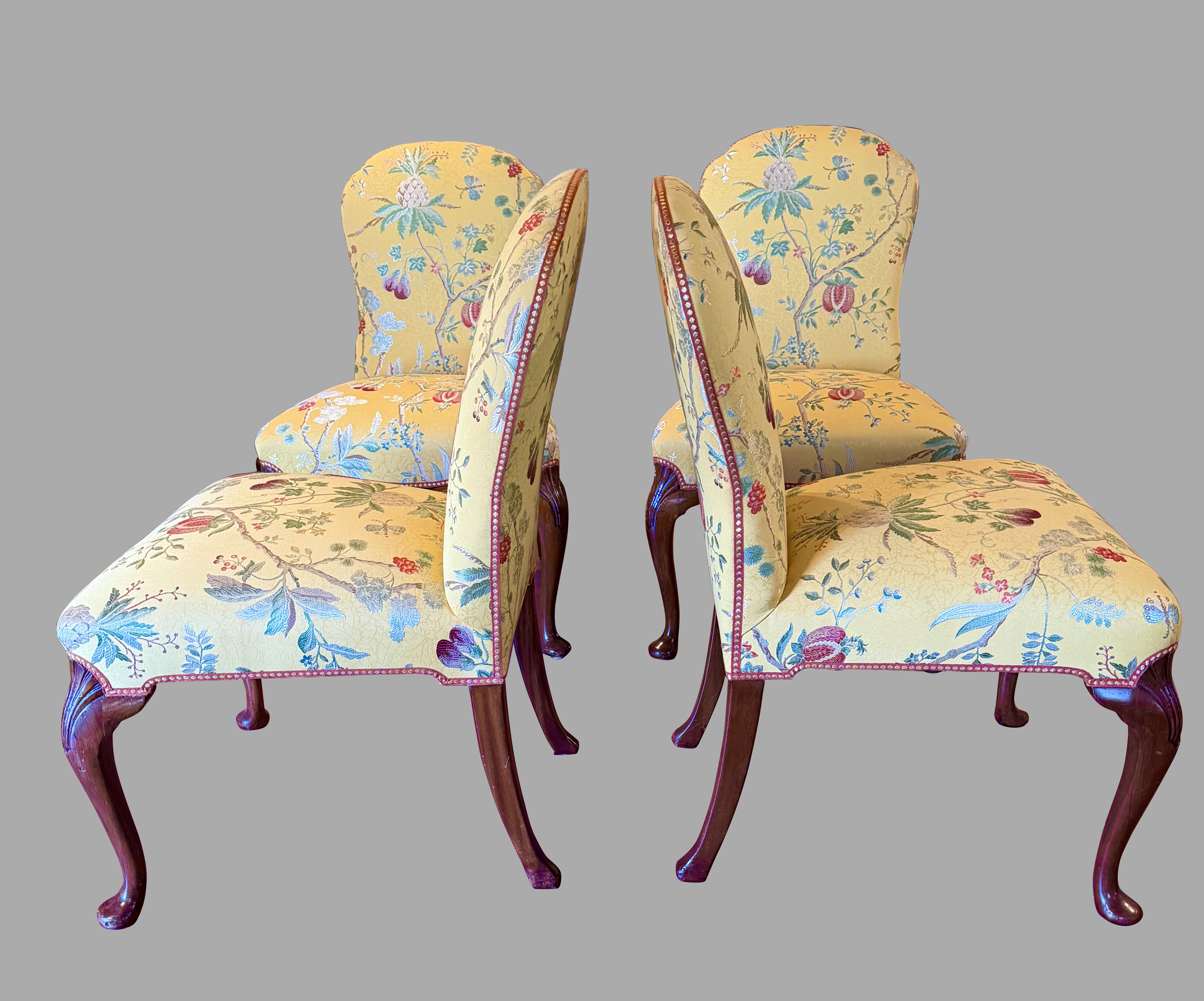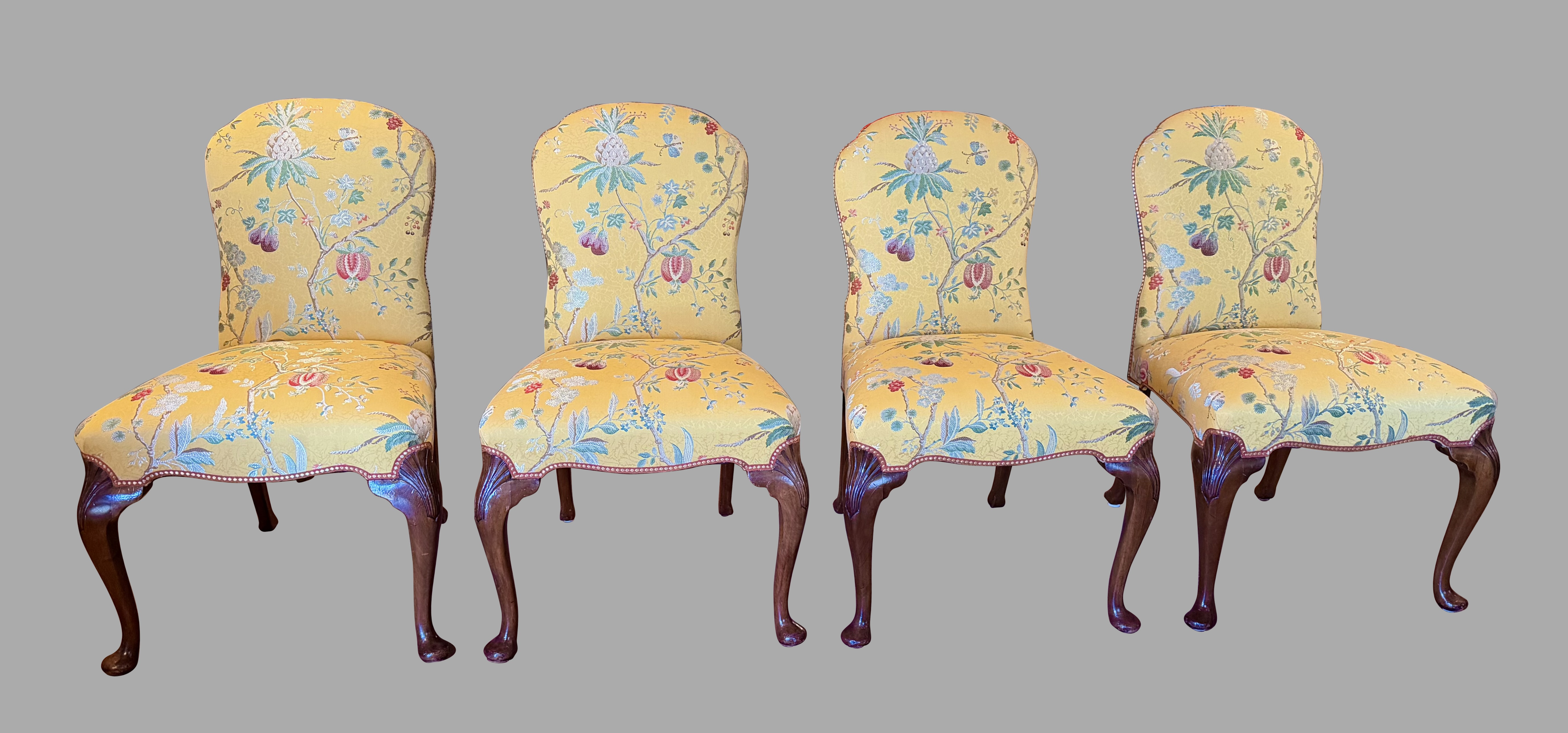 A set of 4 English mahogany upholstered side chairs in the George III style, now covered with a lovely yellow fabric decorated overall with red and green flowers and fruits on vines.The chairs are ample in size and classically elegant, resting on cabriole legs with shell carved knees ending in pad feet. The upholstery is in good condition and the chairs sit very well. Perfect for around a games or formal breakfast table. Twentieth century.