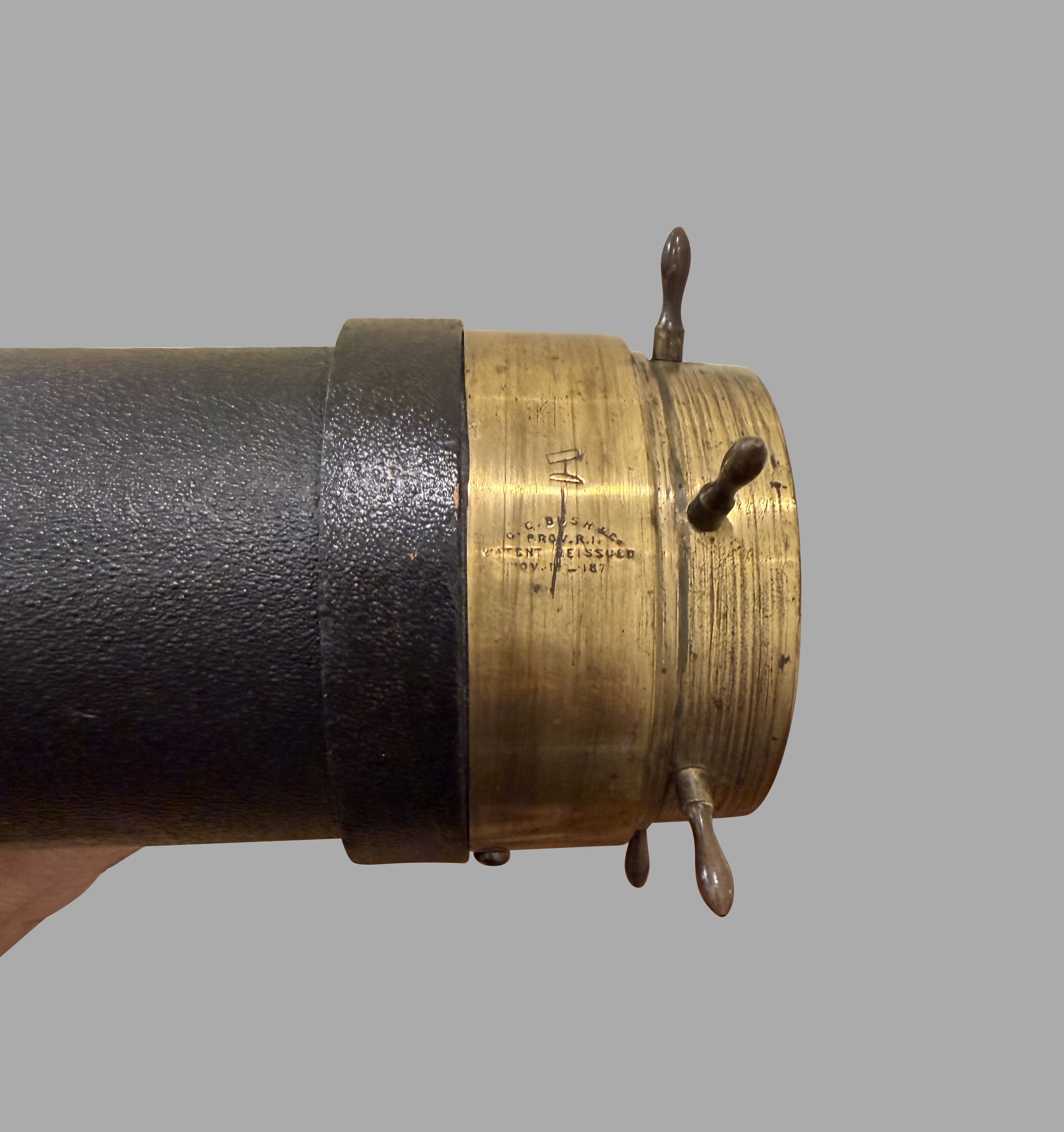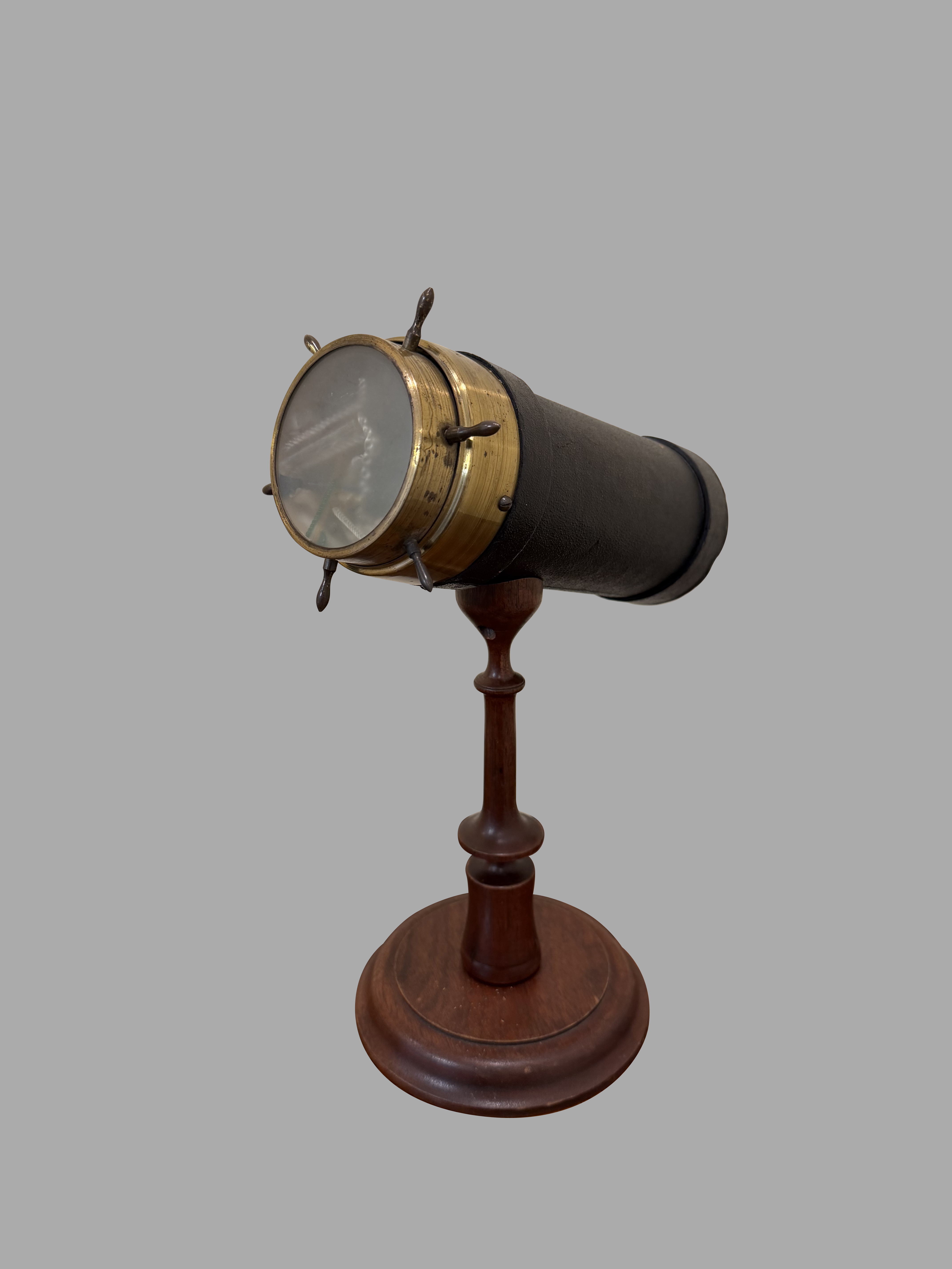 A scarce American kaleidoscope made and signed by Charles Bush consisting of a tubular barrel covered with pebbled paper with a cylindrical eye piece and a brass mounted chamber on the end. The kaleidoscope is activated by turning the spokes. The chamber box contains colored glass pieces in various forms as well as liquid filled ampules. When exposed to light through its lens, it reveals various changing geometric patterns. Now mounted on a mahogany stand, possibly of a later date. C.G. Bush and Company was based in Providence Rhode Island.