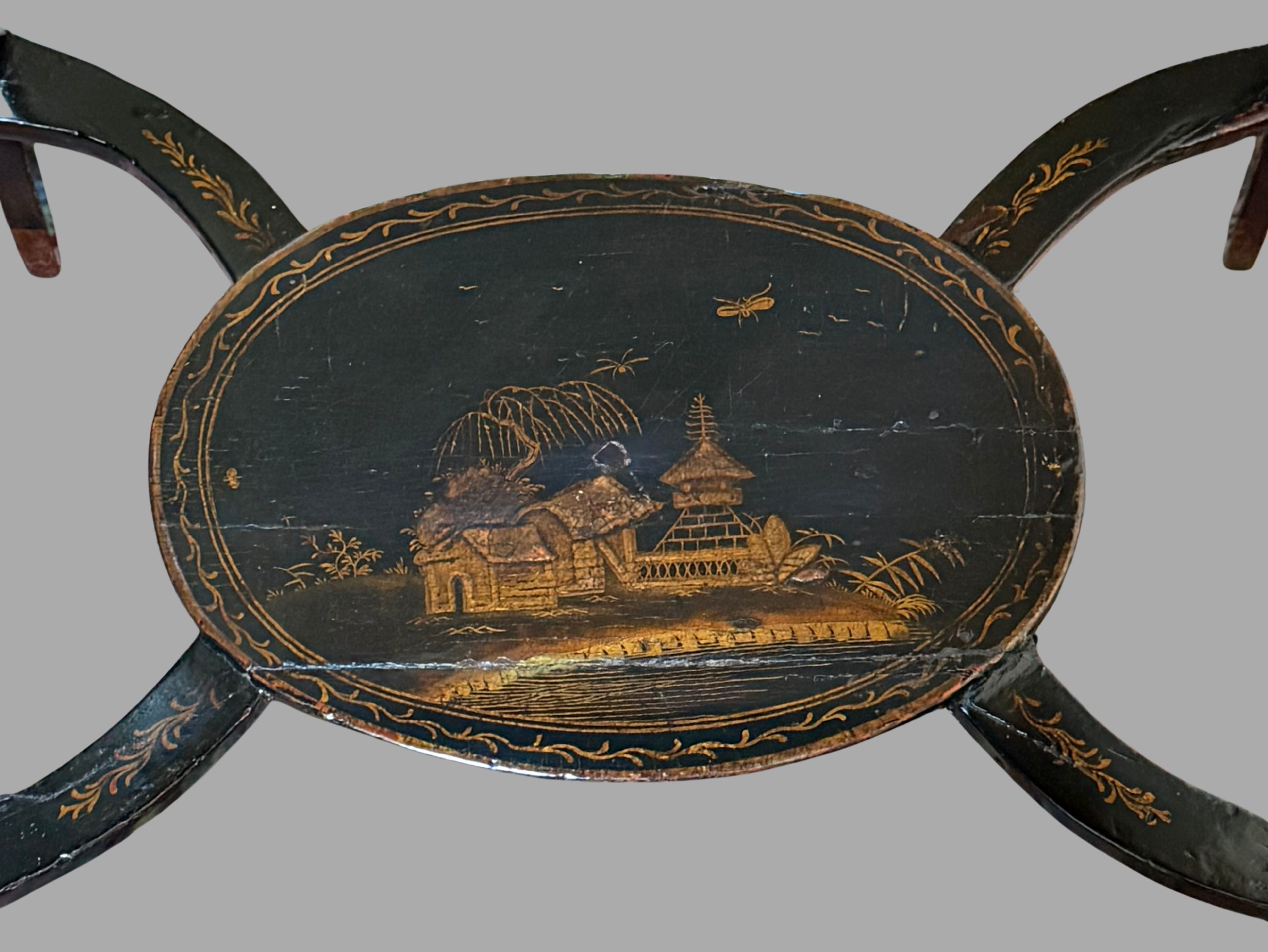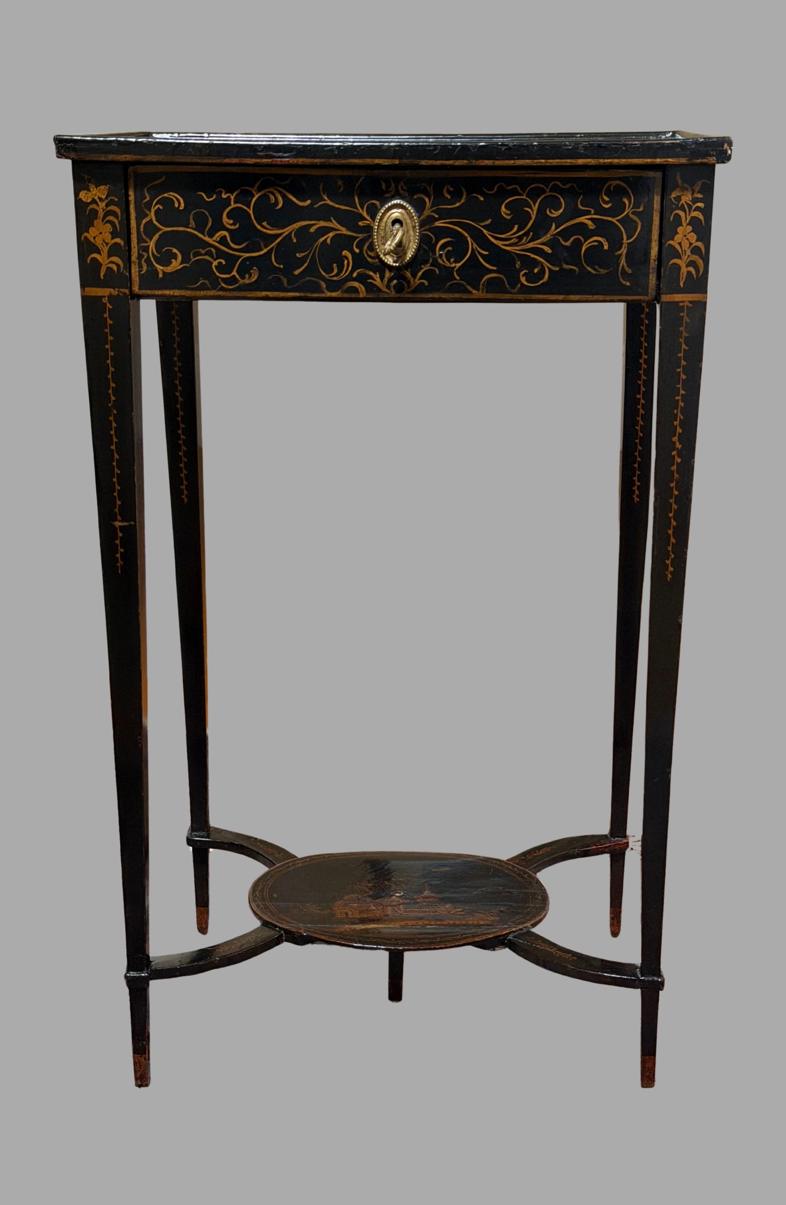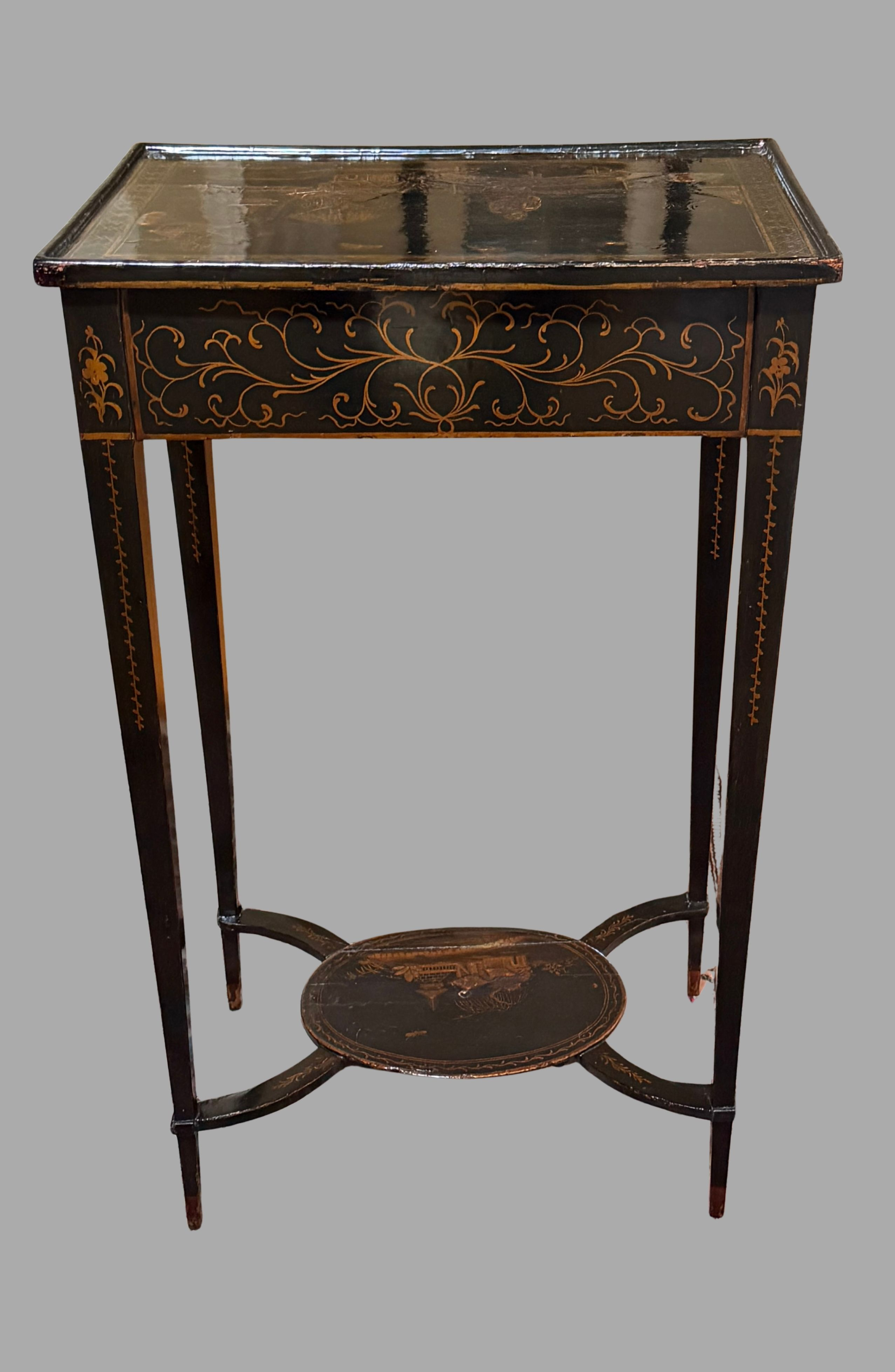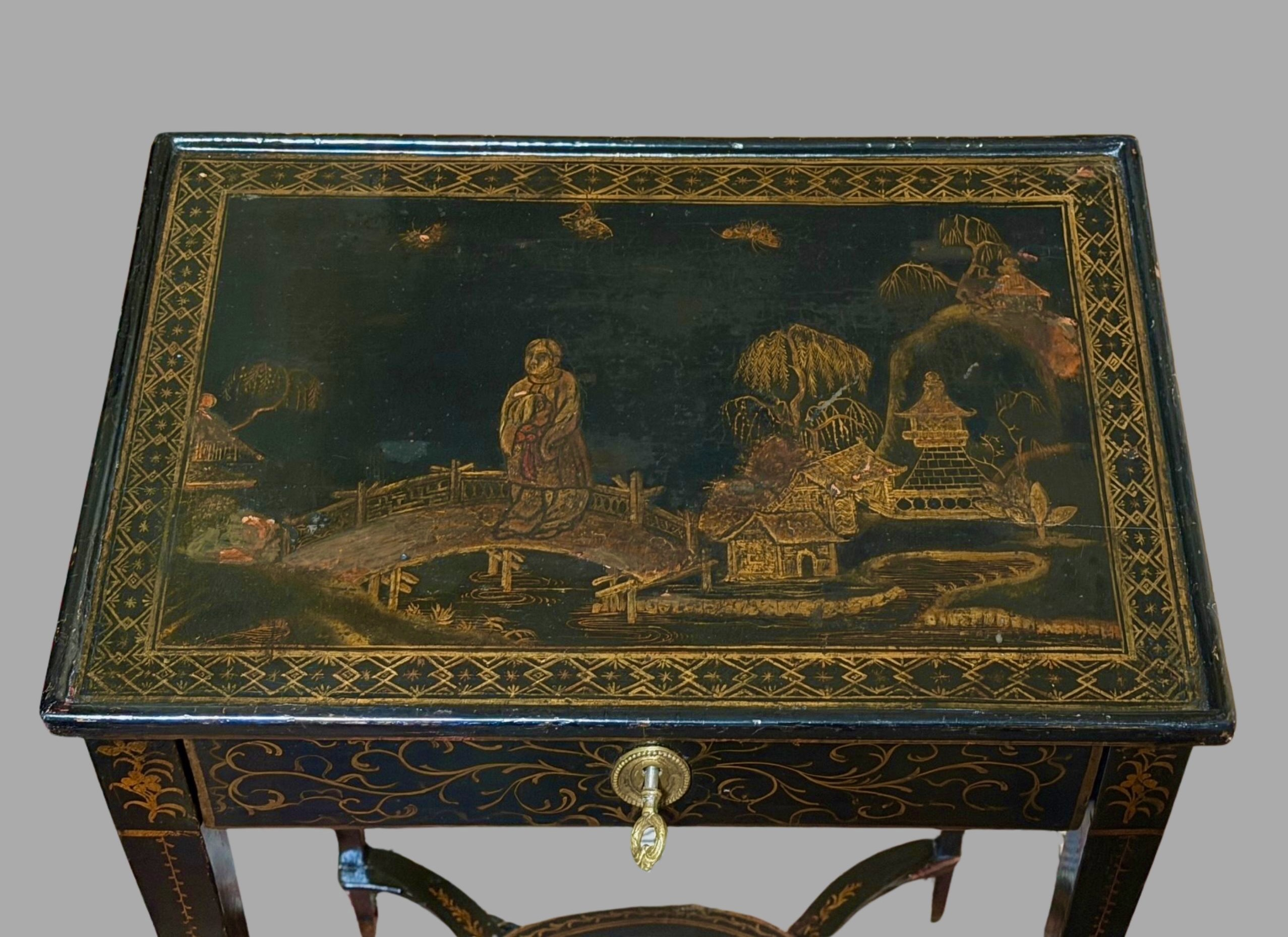 A lovely Chinese export black lacquer occasional table, the top decorated with an elaborate bucolic scene depicting a large figure on a bridge over a steam in a landscape setting with butterflies and houses in the background. The central drawer is fitted with 3 small interior drawers and decorated with gold foliate accents. Each of the sides are decorated with complimentary gold foliate designs. This table rests on square tapered legs joined by an elaborate curved stretcher with a central decorated panel depicting a structure and a butterfly. An elegant and and quite beautiful piece of furniture. Complete with key. Circa 1850-1870.