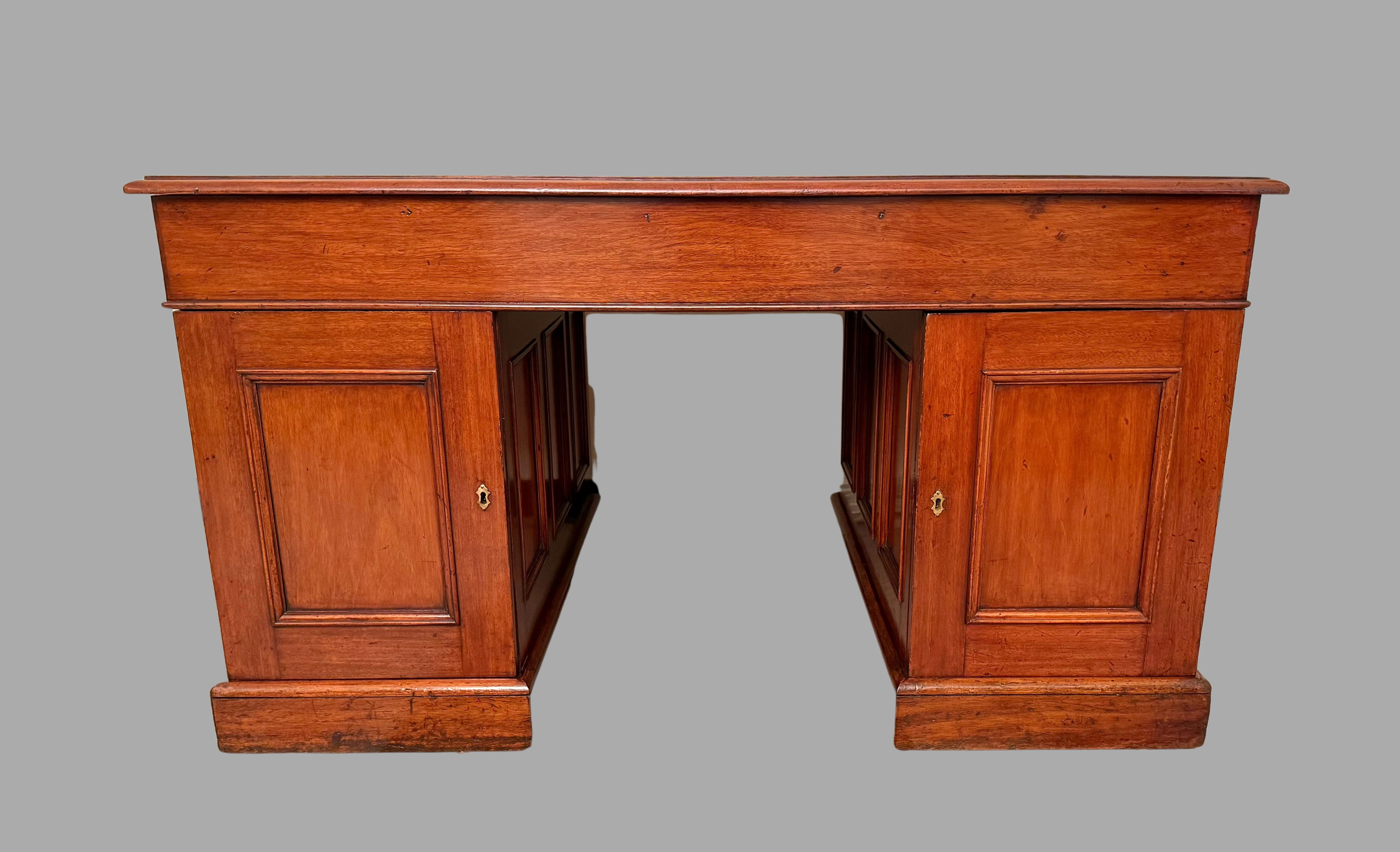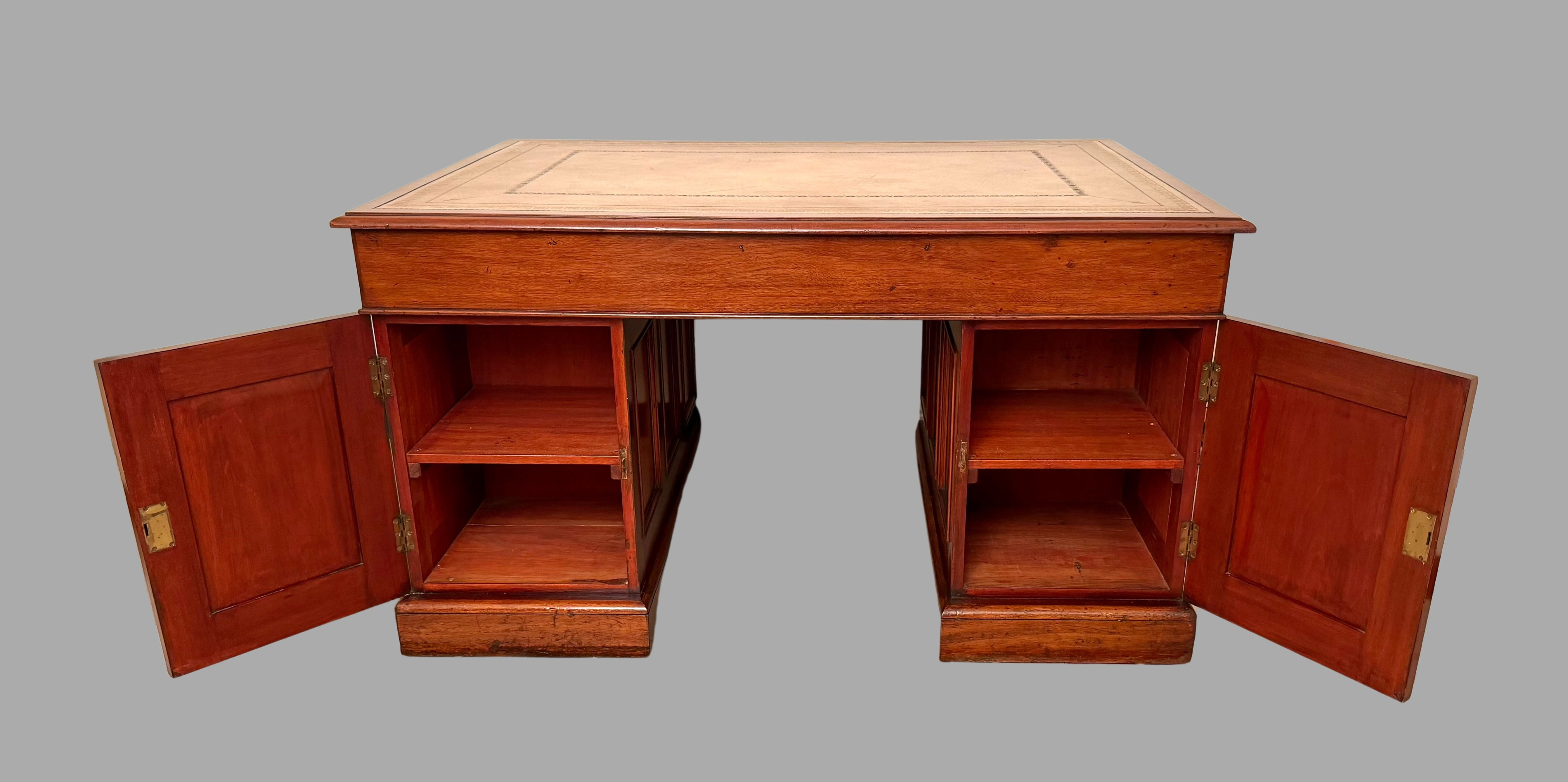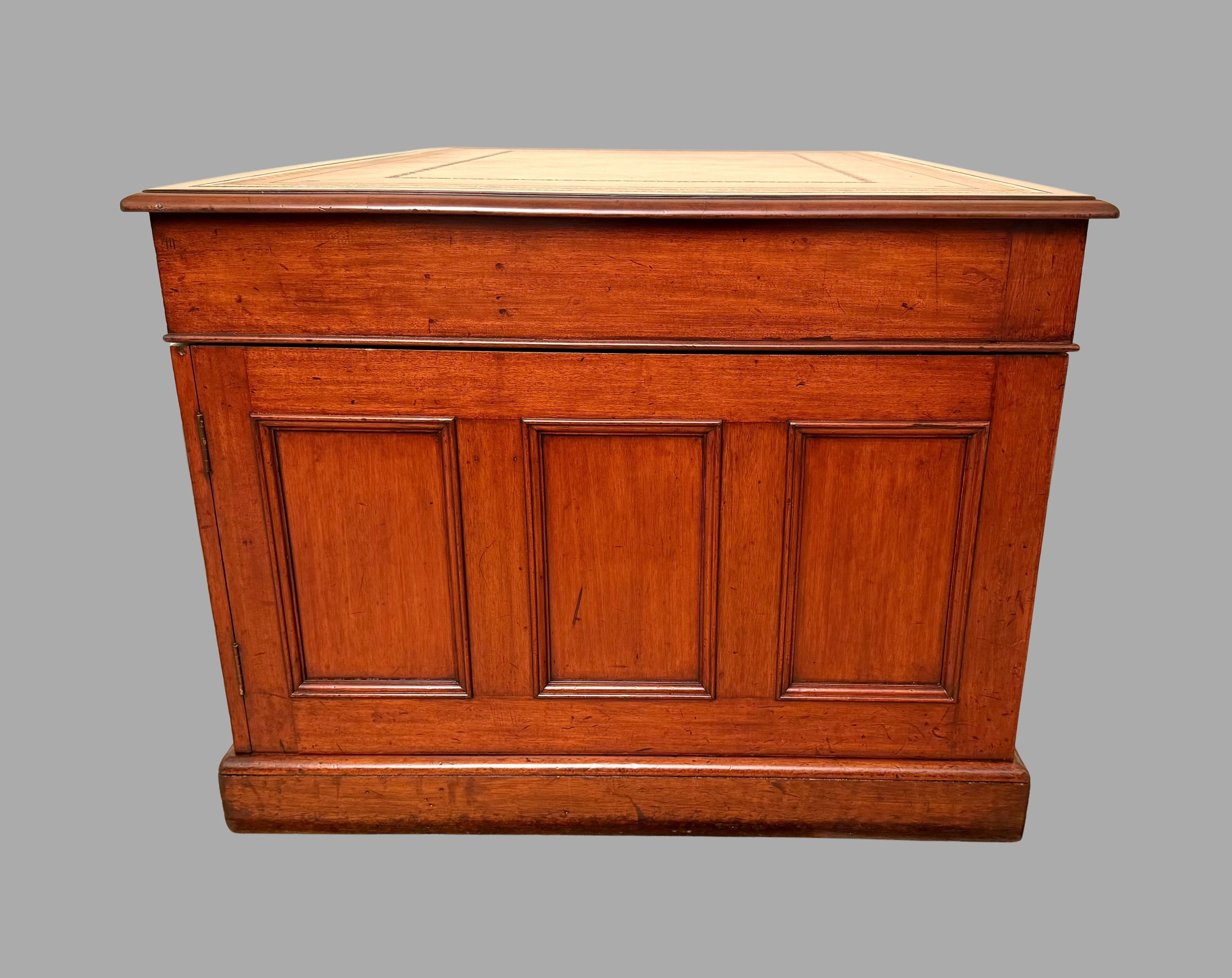 A very good quality English mahogany partners desk, the tan gilt-tooled leather lined top above 3 frieze drawers resting on plinth bases, the reverse fitted with 2 cupboards and no additional drawers. The sides are deeply paneled. Retains its original brass hardware. This desk breaks down into 3 sections for easy moving. Versatile compact size. Circa 1860.