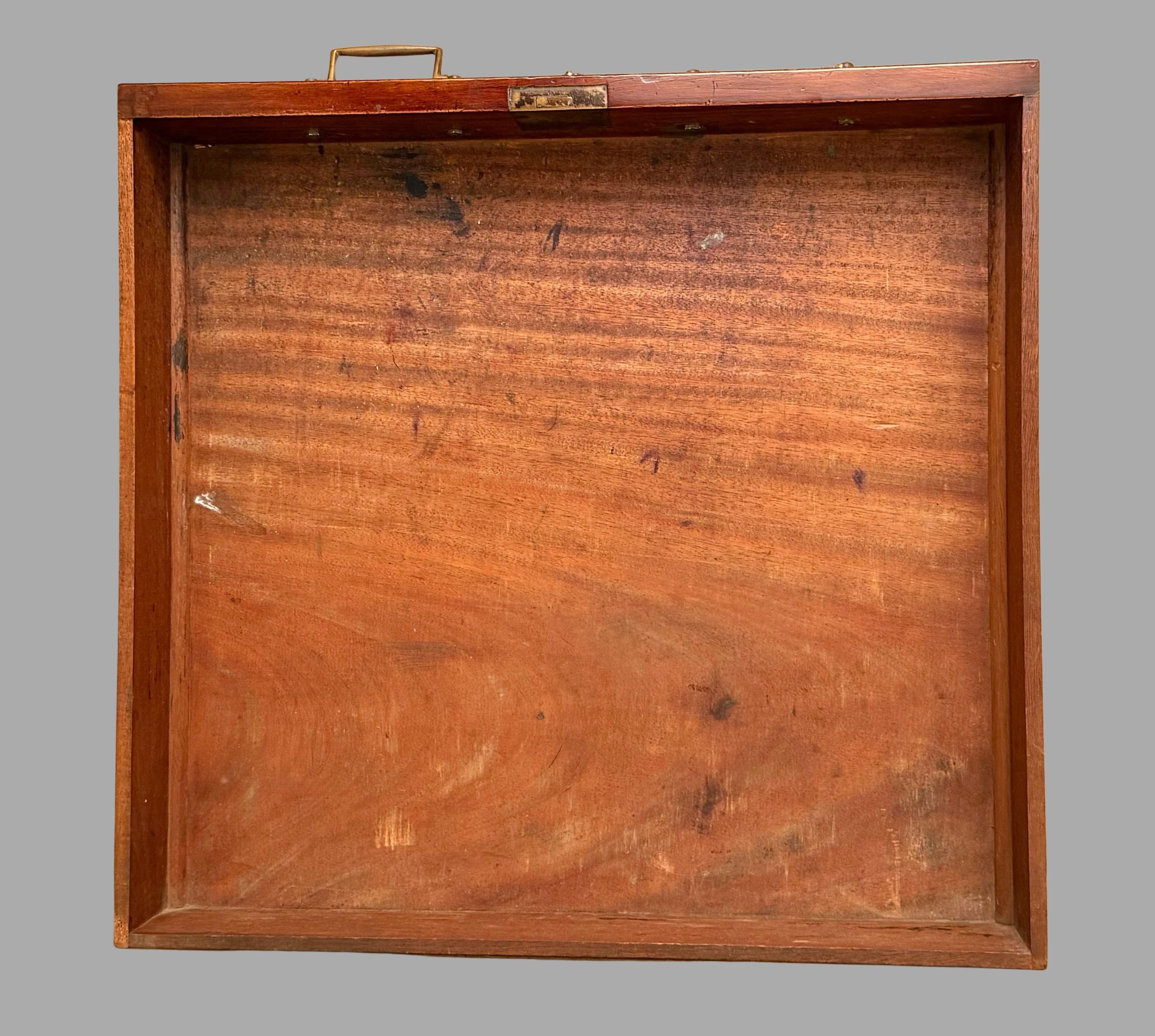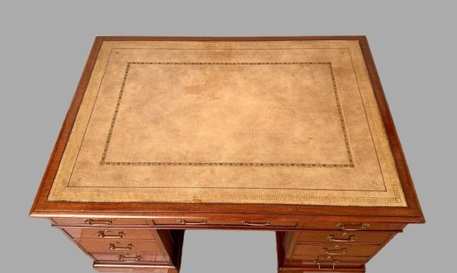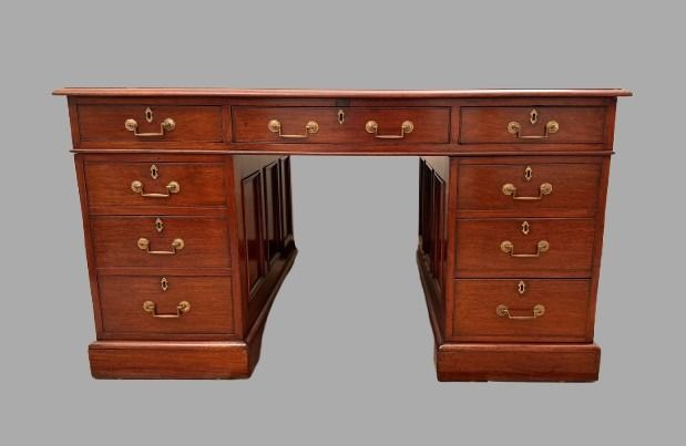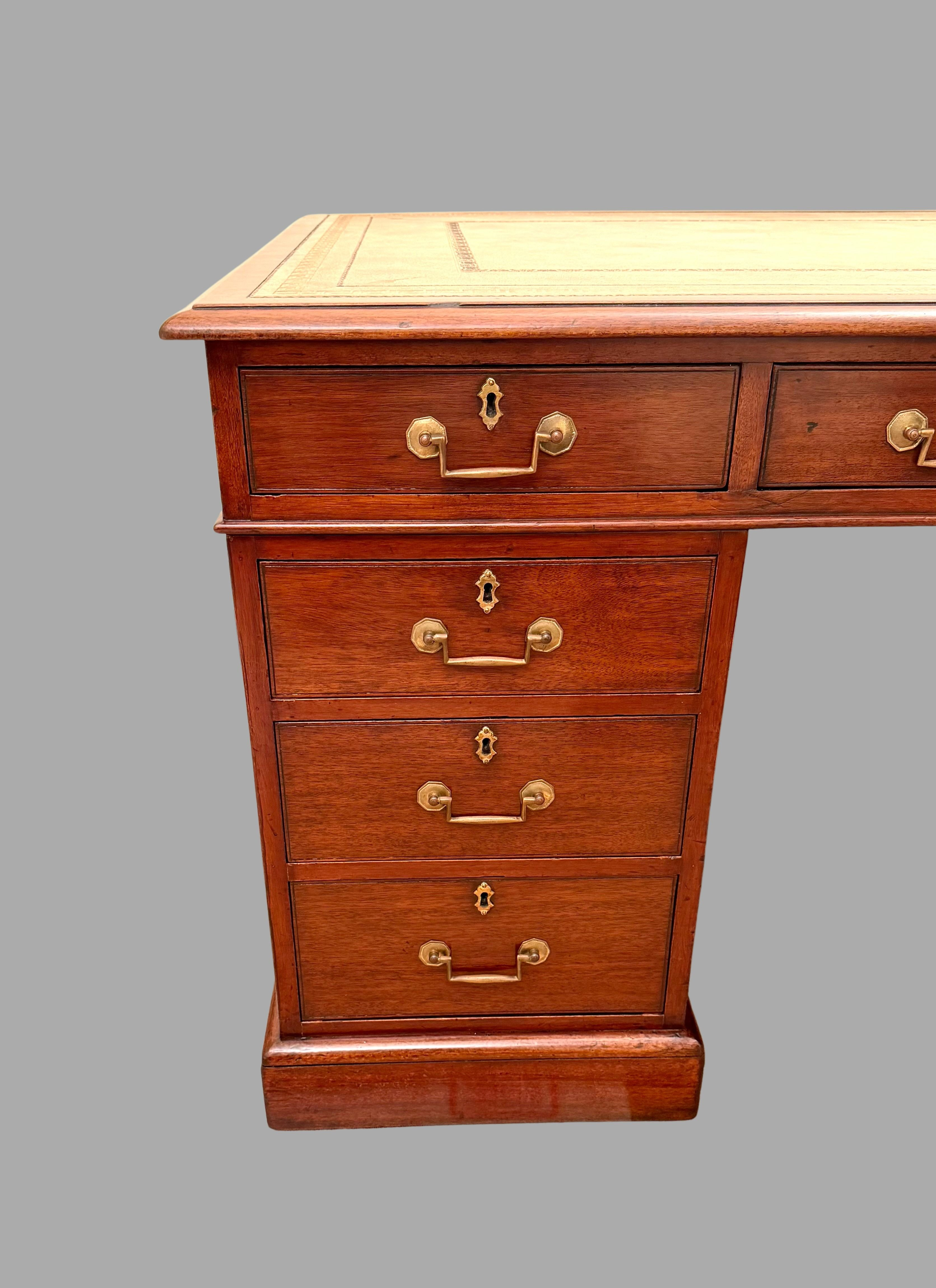 A very good quality English mahogany partners desk, the tan gilt-tooled leather lined top above 3 frieze drawers resting on plinth bases, the reverse fitted with 2 cupboards and no additional drawers. The sides are deeply paneled. Retains its original brass hardware. This desk breaks down into 3 sections for easy moving. Versatile compact size. Circa 1860.