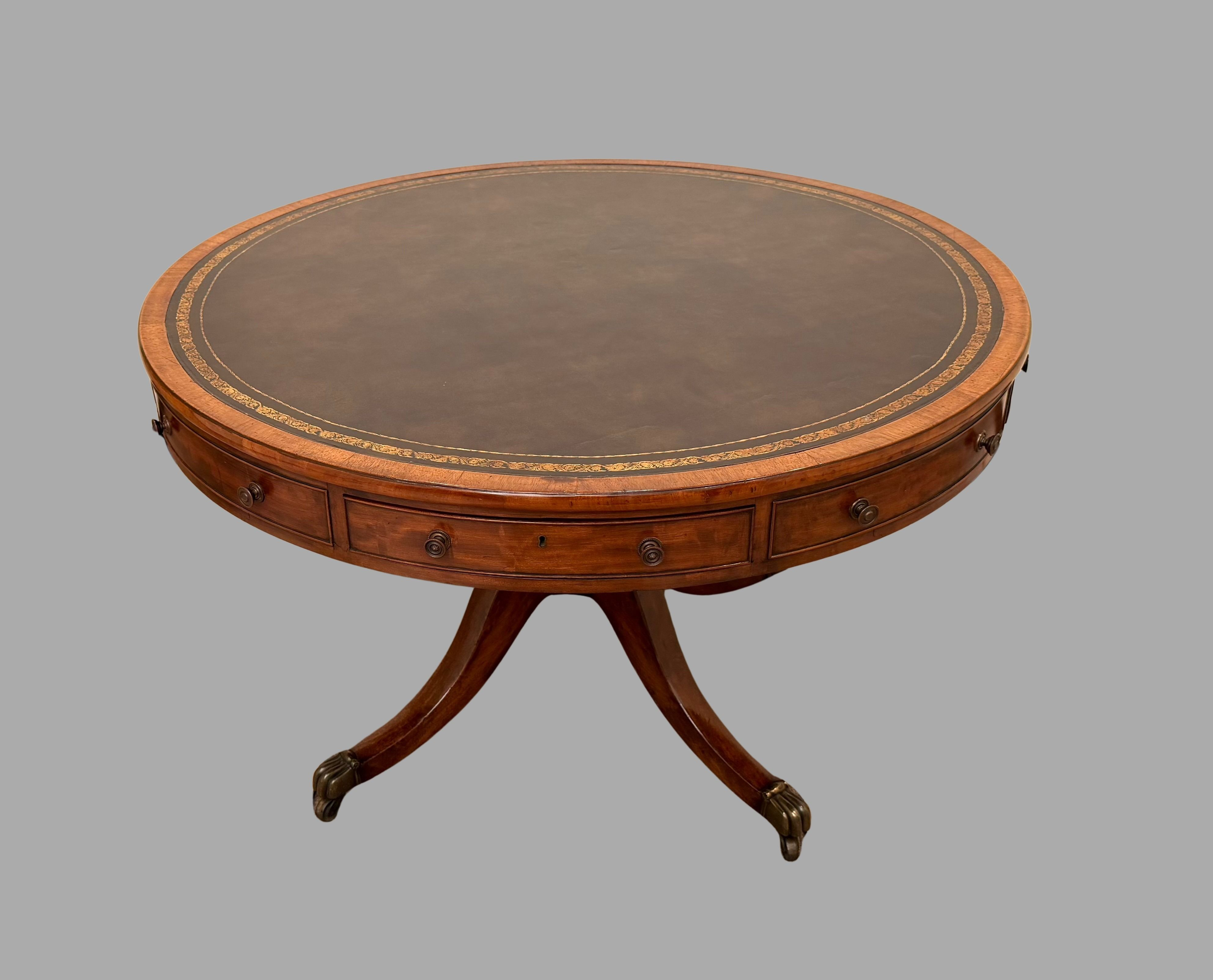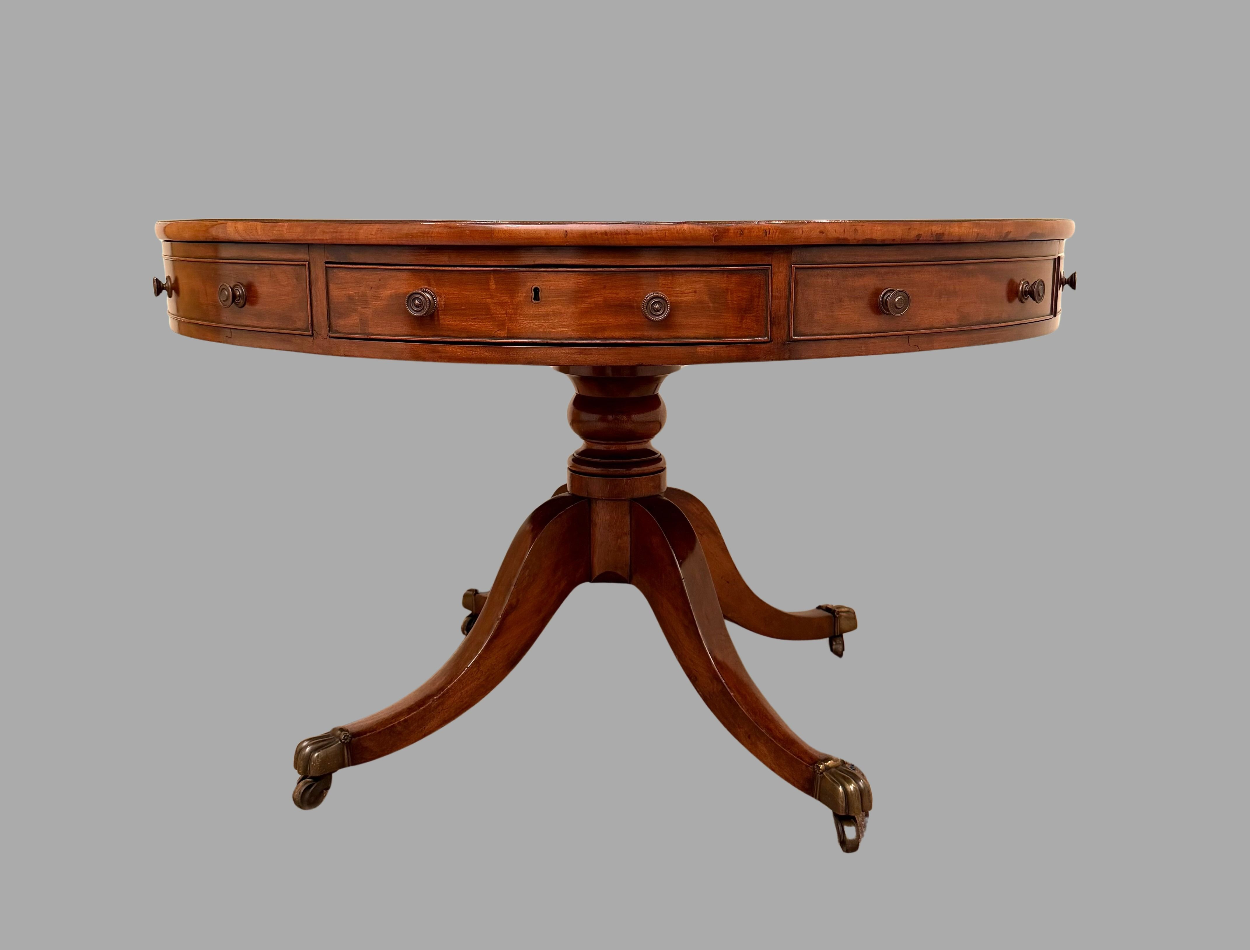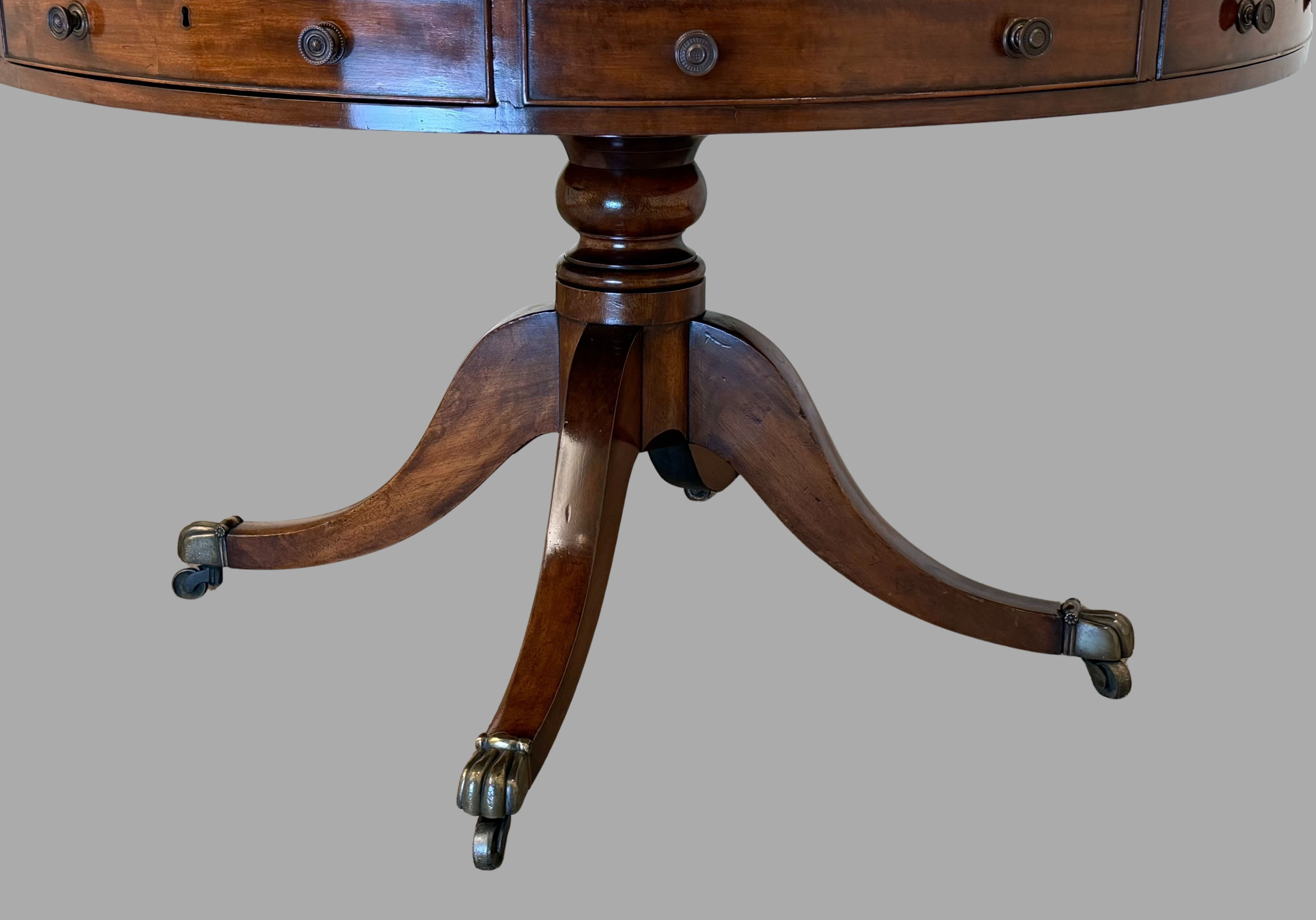 A fine quality English mahogany drum table the green gilt tooled leather top over 4 functional and 4 dummy drawers supported on a quadripartite base ending in brass caps with casters. Circa 1840.